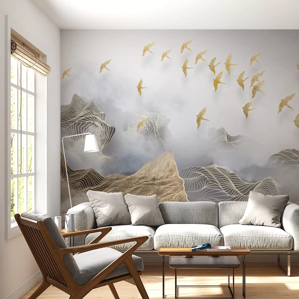 Fototapeedid Õhukestest joontest on joonistatud imeline maastik koos mägede ja lindudega Nr u44870
