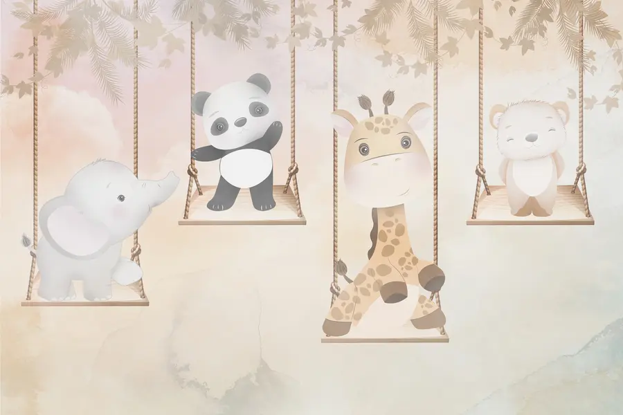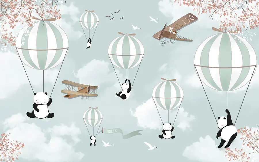 Akvarelljoonistus loomade, õhupallide, lennuki ja autoga