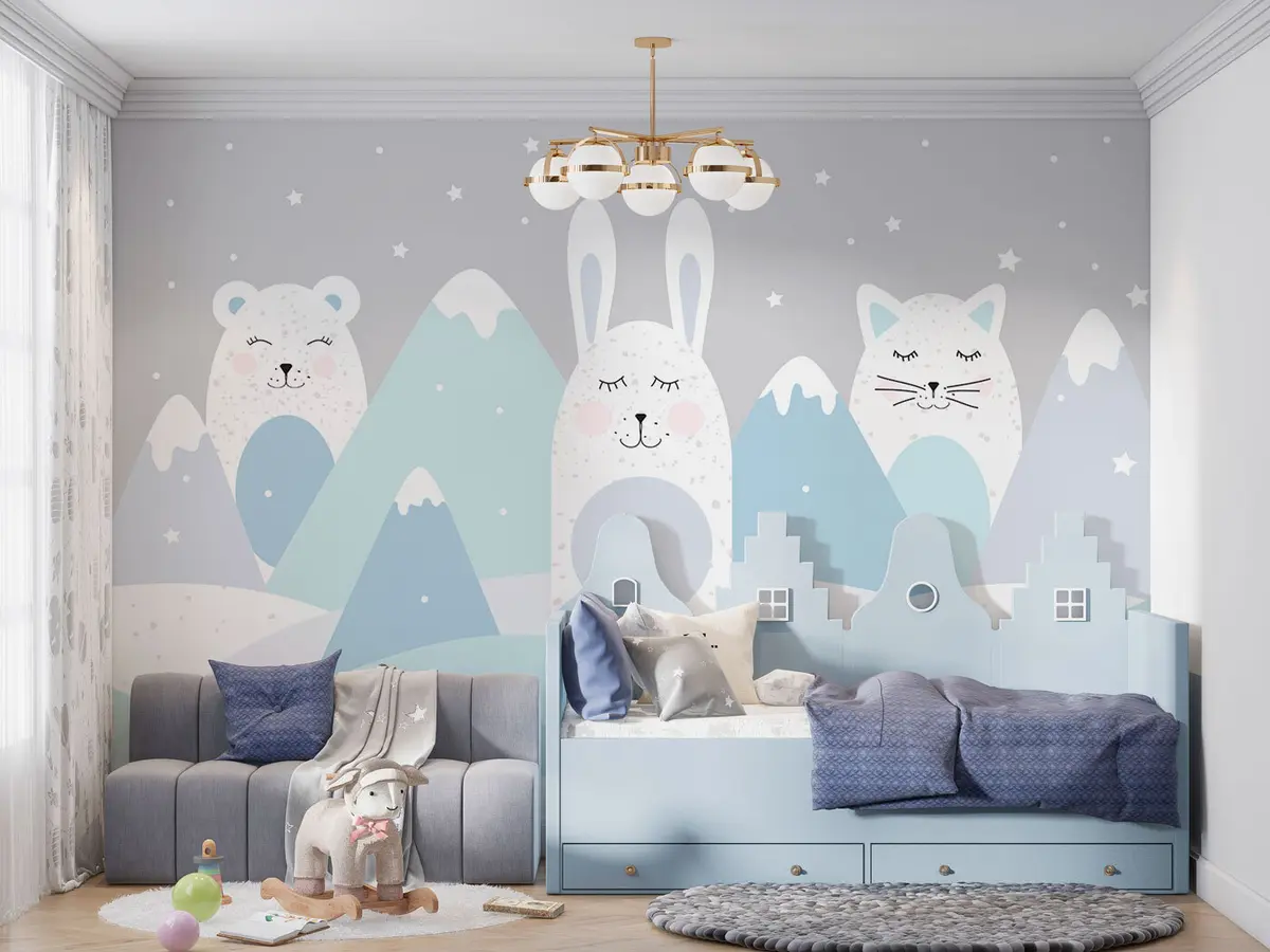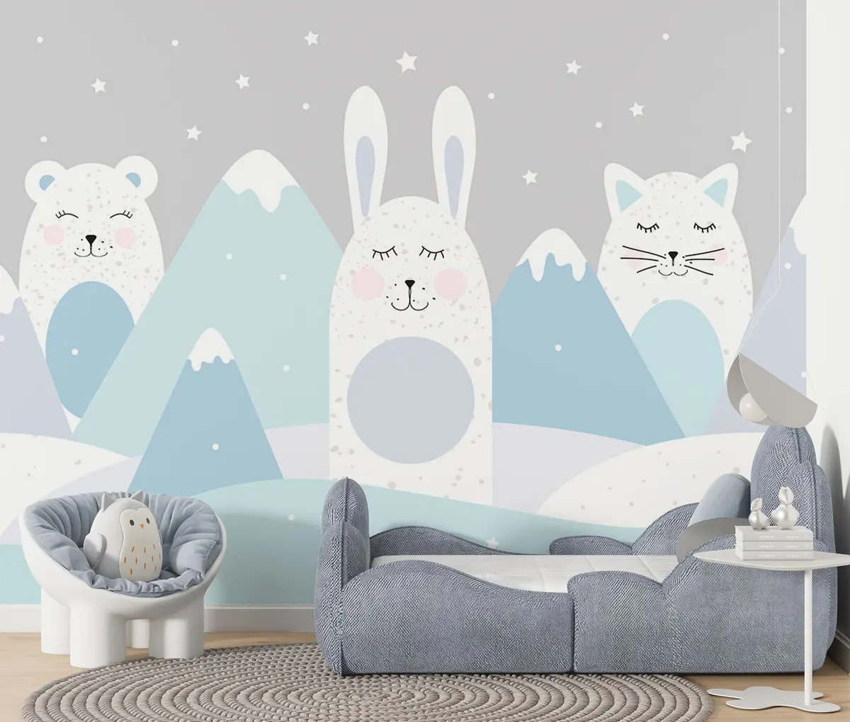 Fototapeedid Jänes, karu, rebane beeži lumega kaetud mägede taustal Nr u98135v1