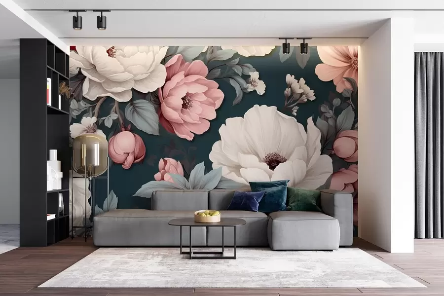 Heledad pastellroosad peonid pehmete, tekstuursete õrnade kroonlehtedega, mis on tihedalt paigutatud, luues tiheda lillekunsti, pehme valgustuse