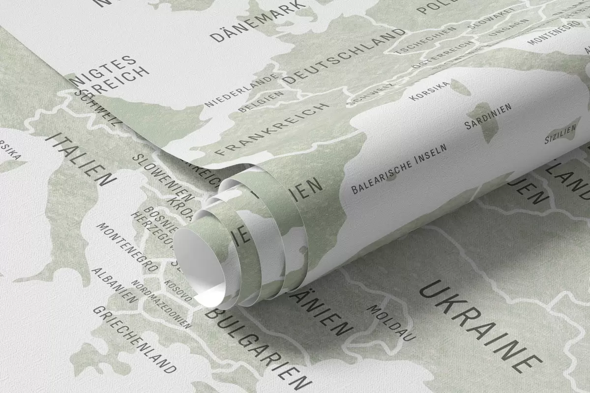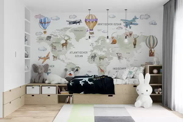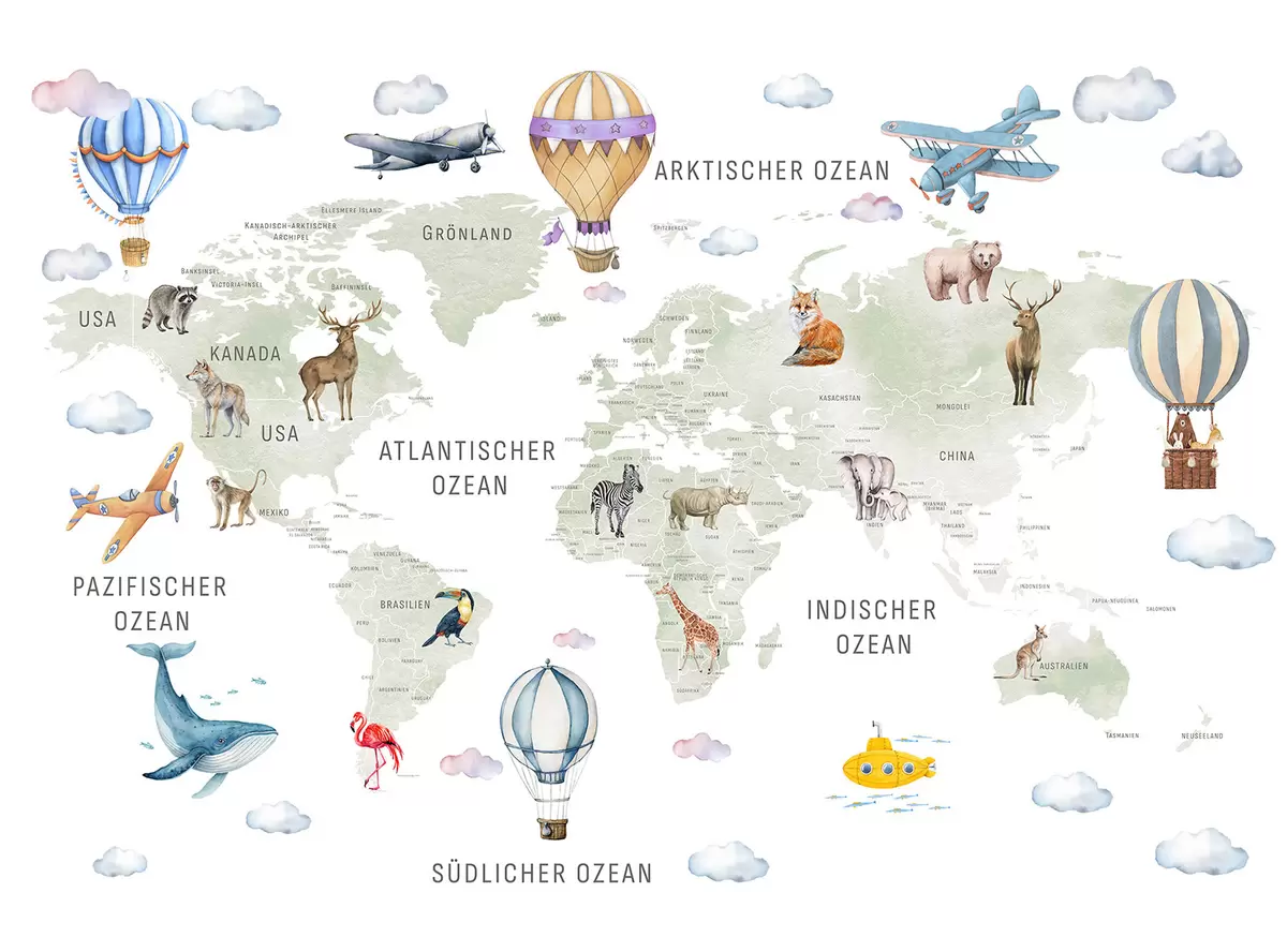 Fototapeedid Laste kaart akvarellstiilis loomade ja kuumaõhupallidega. Saksa keeles. Roheline värv. Nr c00001de