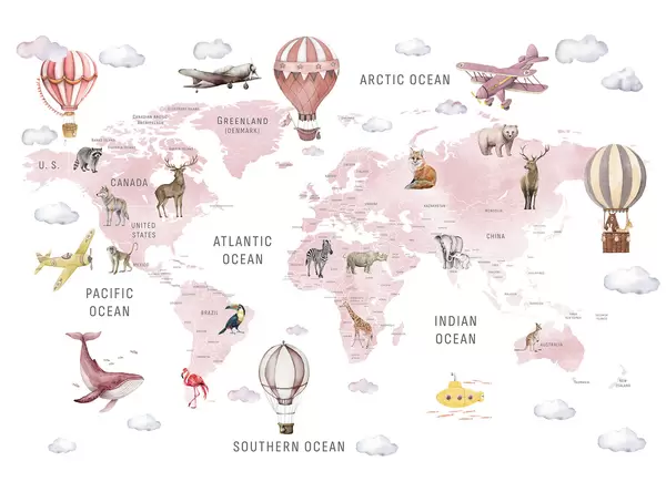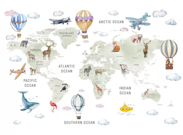 Fototapeedid Laste kaart akvarellstiilis loomade ja kuumaõhupallidega. Inglise keeles. Beež värv. Nr c00001env2