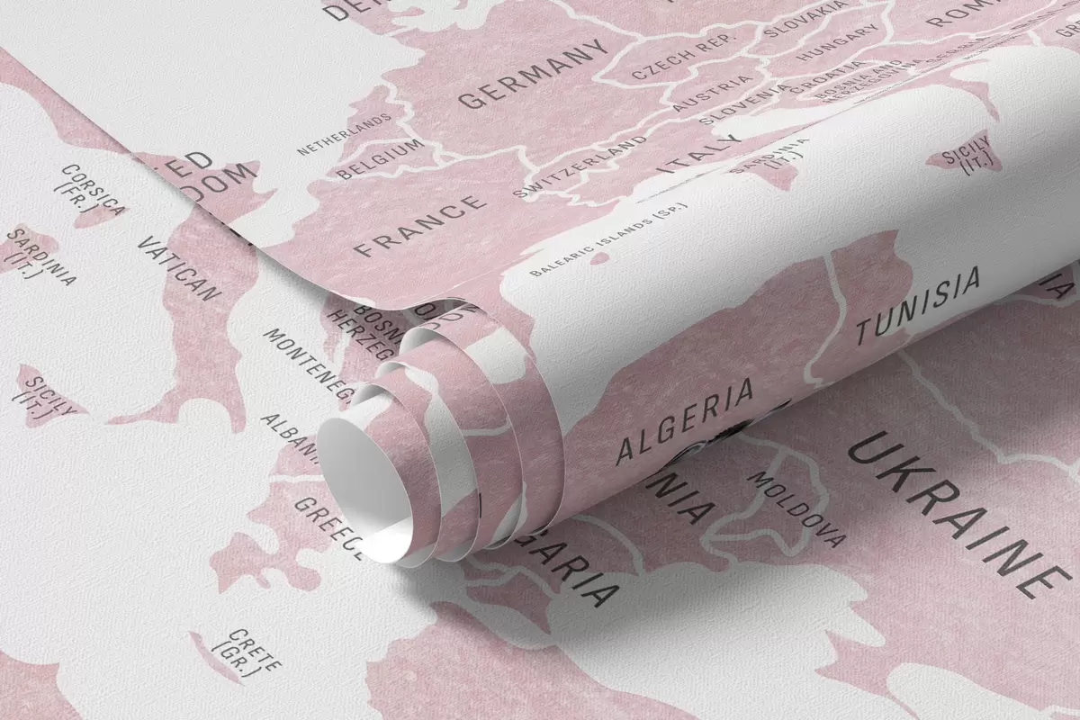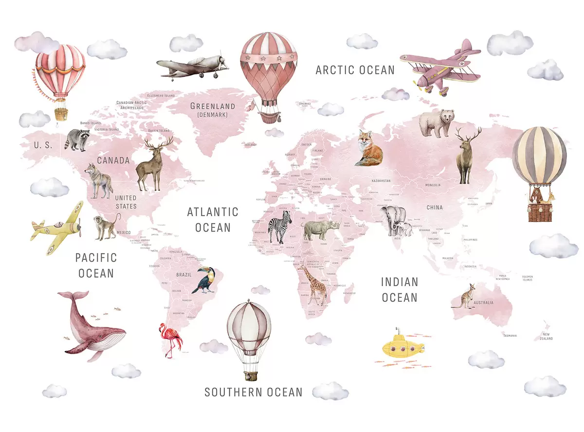 Fototapeedid Laste kaart akvarellstiilis loomade ja kuumaõhupallidega. Inglise keeles. Roosa värvi. Nr c00001env3