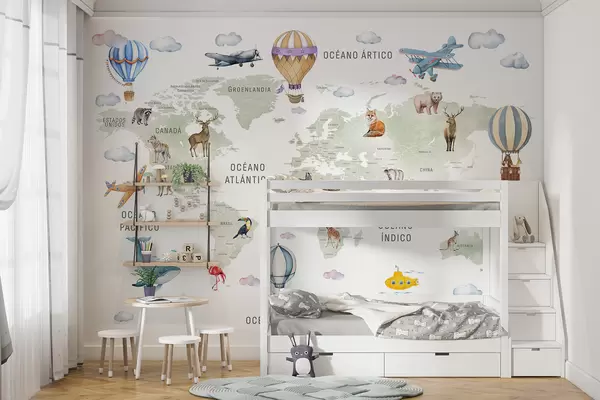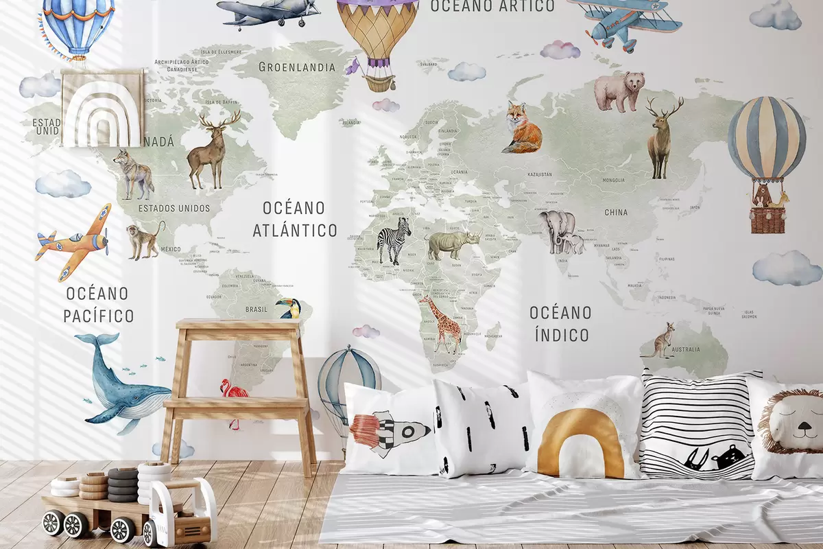 Fototapeedid Laste kaart akvarellstiilis loomade ja kuumaõhupallidega. Hispaania keeles. Roheline värv. Nr c00001es
