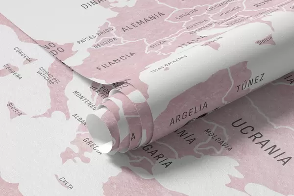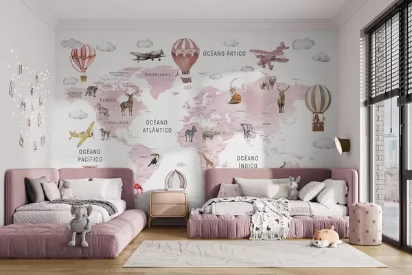 Fototapeedid Laste kaart akvarellstiilis loomade ja kuumaõhupallidega. Hispaania keeles. Roosa värvi. Nr c00001esv3