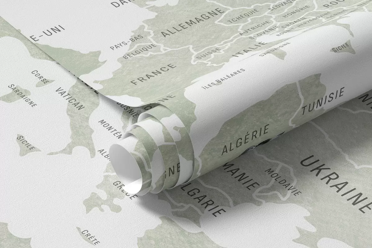Fototapeedid Laste kaart akvarellstiilis loomade ja kuumaõhupallidega. Prantsuse keeles. Roheline värv. Nr c00001fr