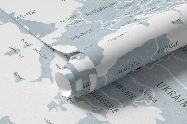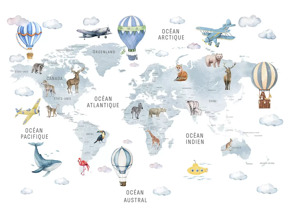 Fototapeedid Laste kaart akvarellstiilis loomade ja kuumaõhupallidega. Prantsuse keeles. Sinine värv. Nr c00001frv1