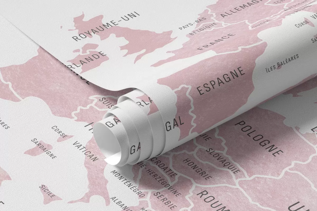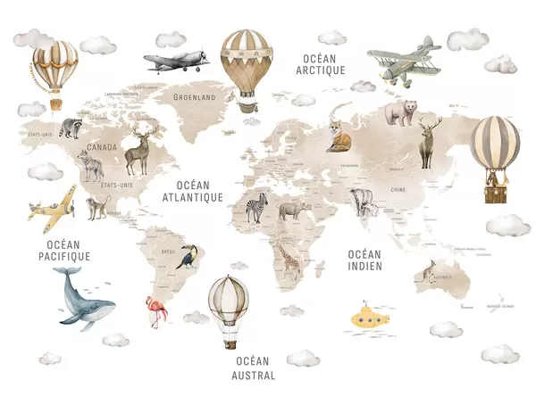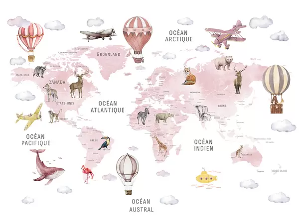 Fototapeedid Laste kaart akvarellstiilis loomade ja kuumaõhupallidega. Prantsuse keeles. Roosa värvi. Nr c00001frv3