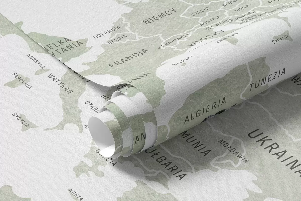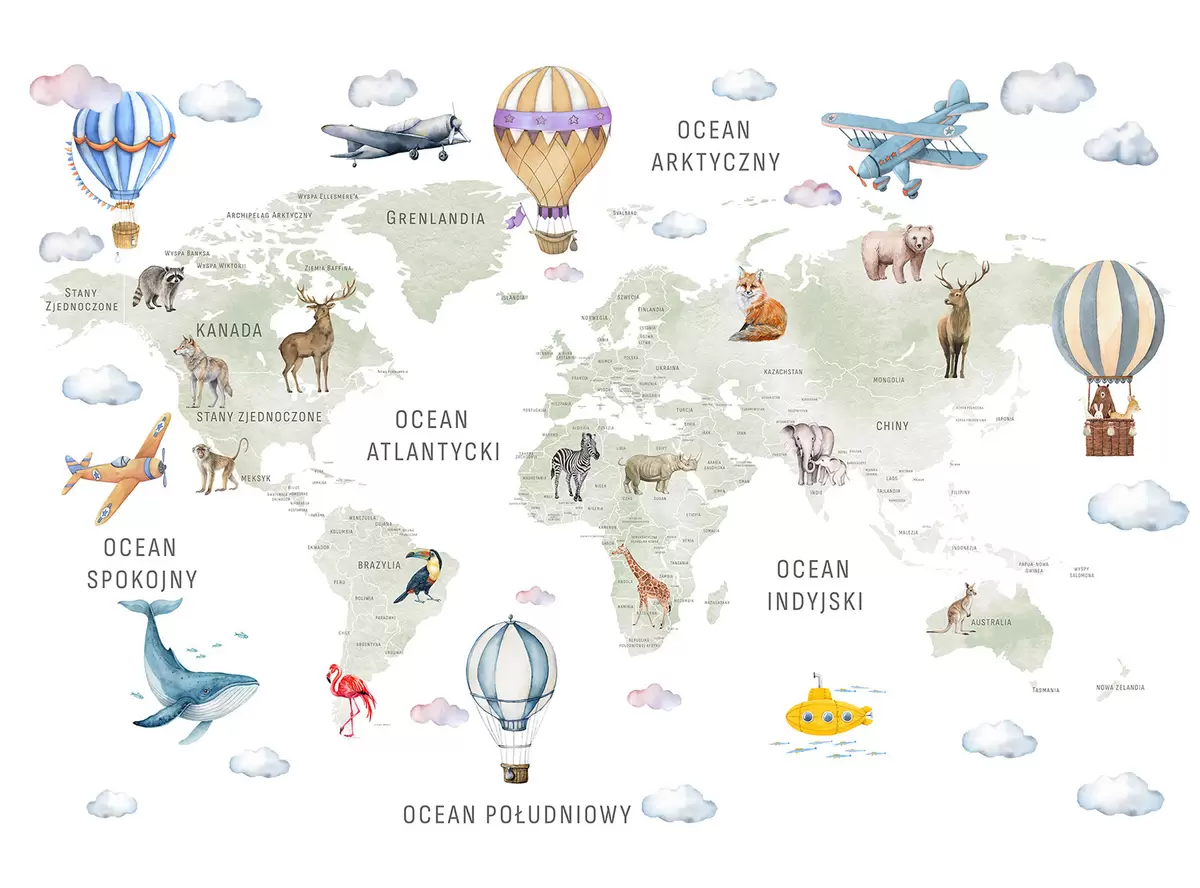 Fototapeedid Laste kaart akvarellstiilis loomade ja kuumaõhupallidega. Poola keeles. Roheline värv. Nr c00001pl