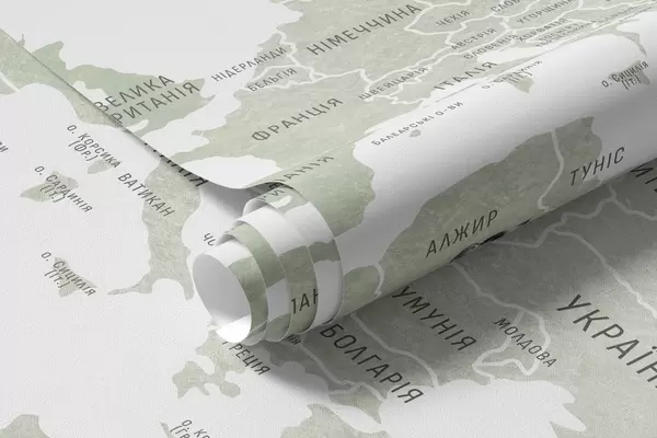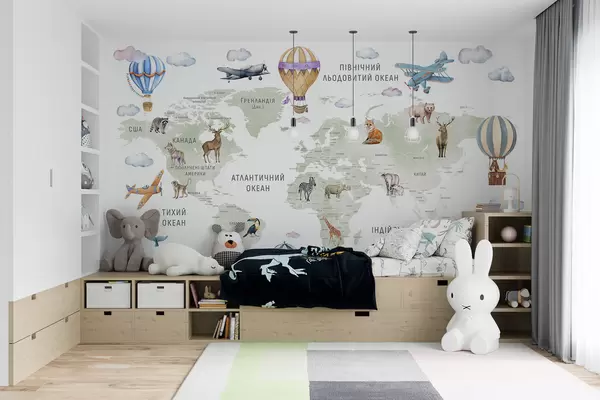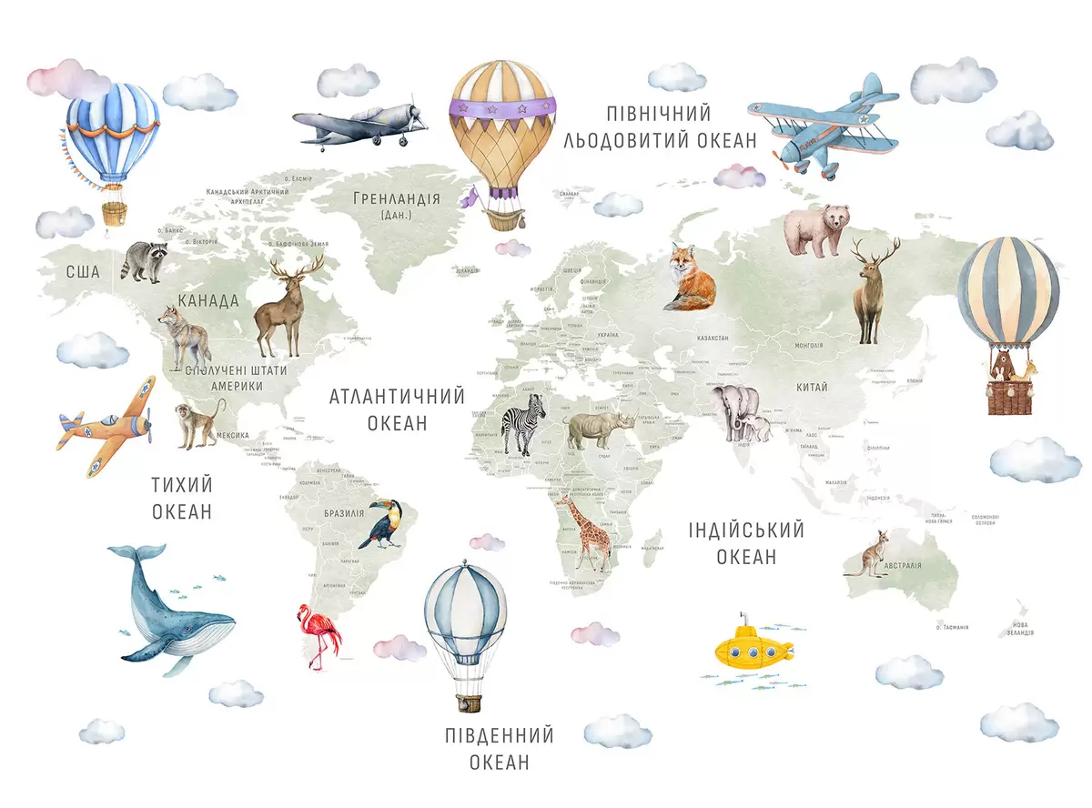 Fototapeedid Laste kaart akvarellstiilis loomade ja kuumaõhupallidega. Ukraina keeles. Roheline värv. Nr c00001uk
