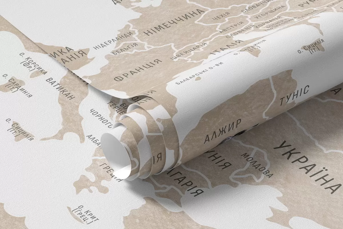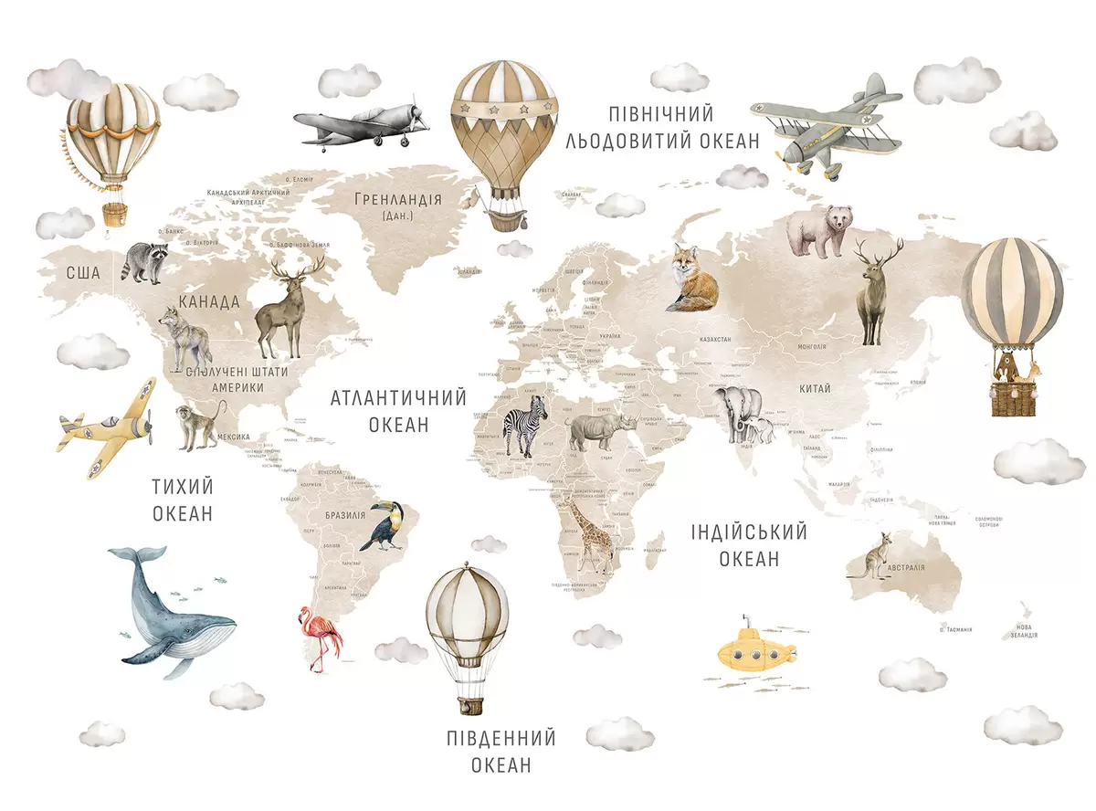 Fototapeedid Laste kaart akvarellstiilis loomade ja kuumaõhupallidega. Ukraina keeles. Beež värv. Nr c00001ukv2