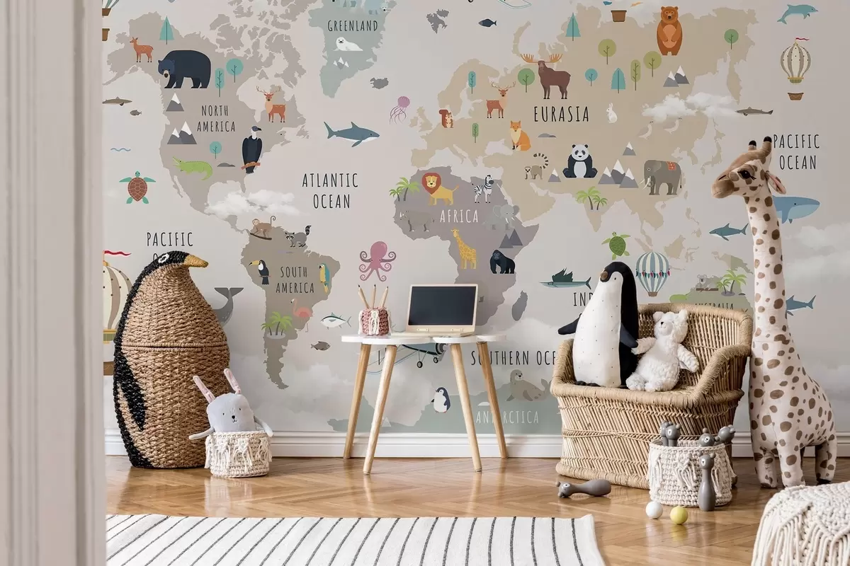 Fototapeedid Laste maailmakaart loomade ja kuumaõhupallidega. Inglise keeles Nr c00002en