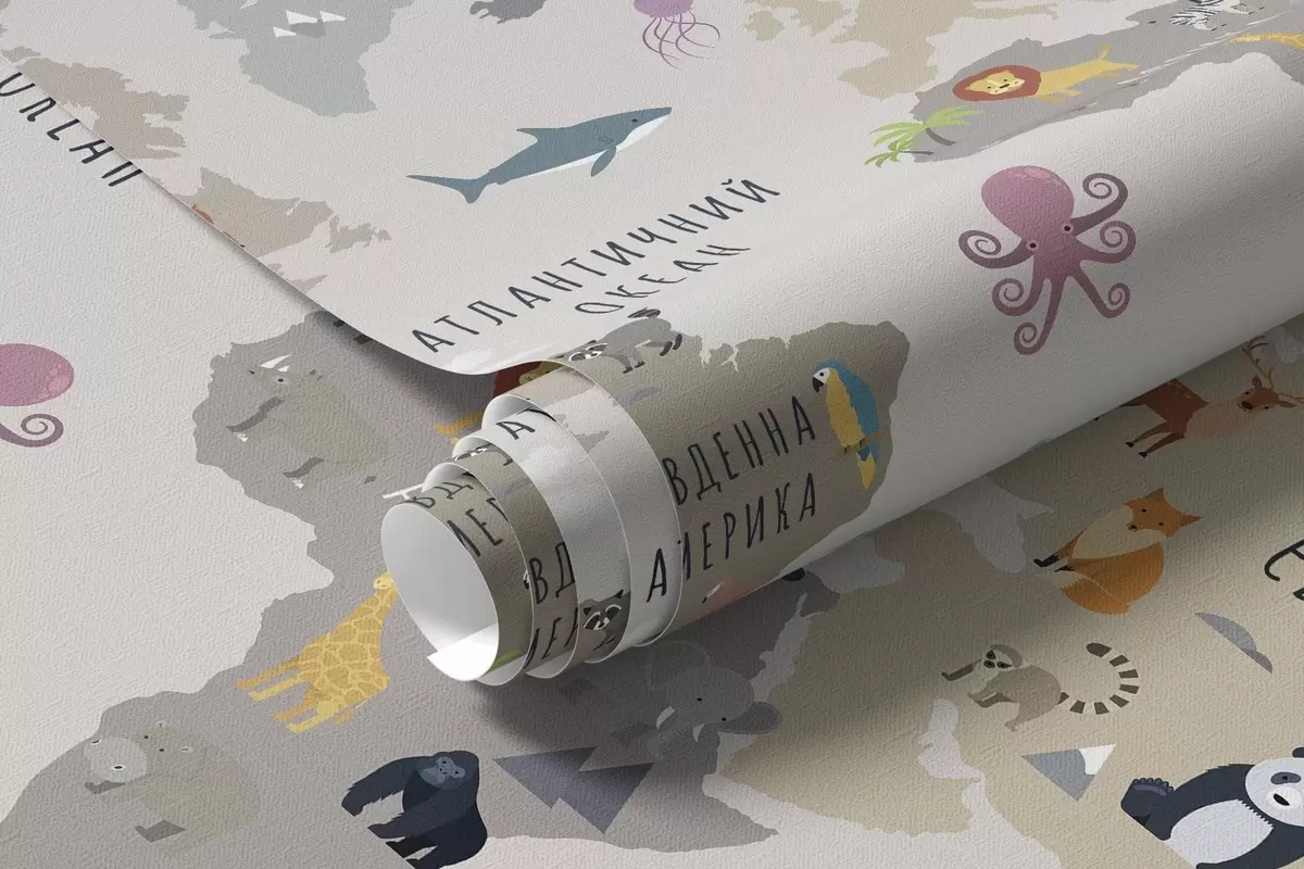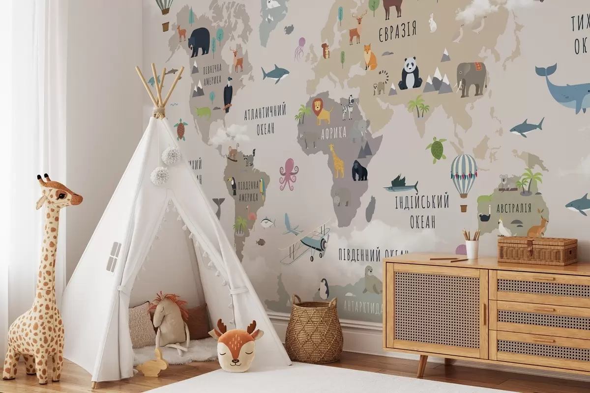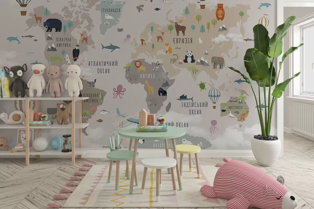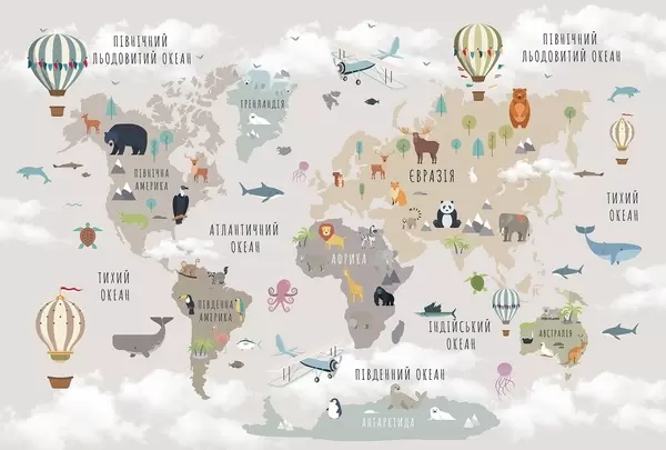 Fototapeedid Laste maailmakaart loomade ja kuumaõhupallidega. Ukraina keeles Nr c00002uk
