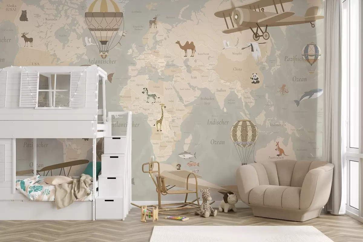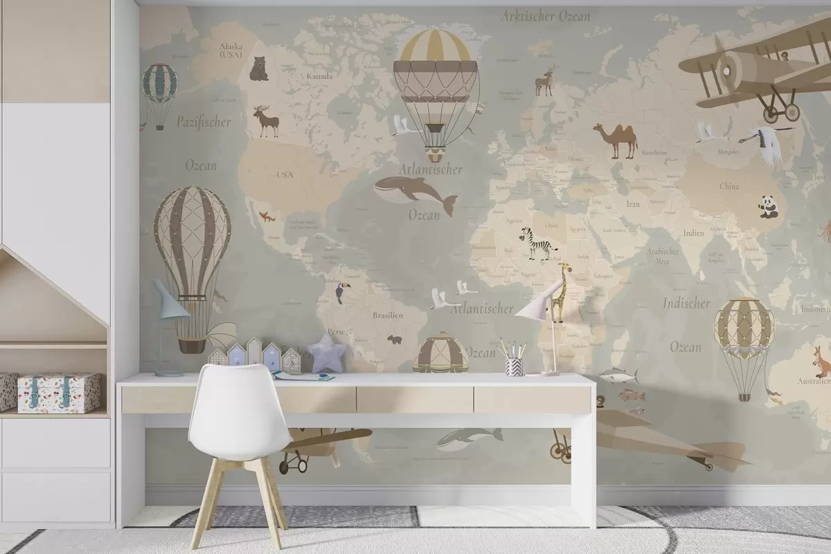 Fototapeedid Laste maailmakaart loomade, lennukite ja kuumaõhupallidega. Saksa keeles. Beež värv Nr c00003de