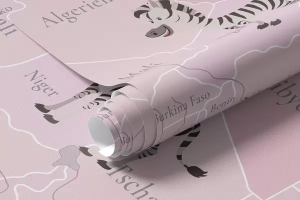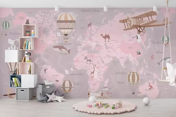 Fototapeedid Laste maailmakaart loomade, lennukite ja kuumaõhupallidega. Saksa keeles. Roosa värv Nr c00003dev3