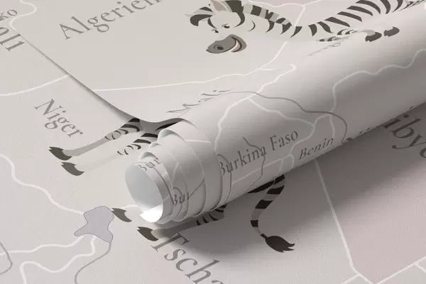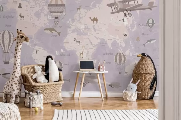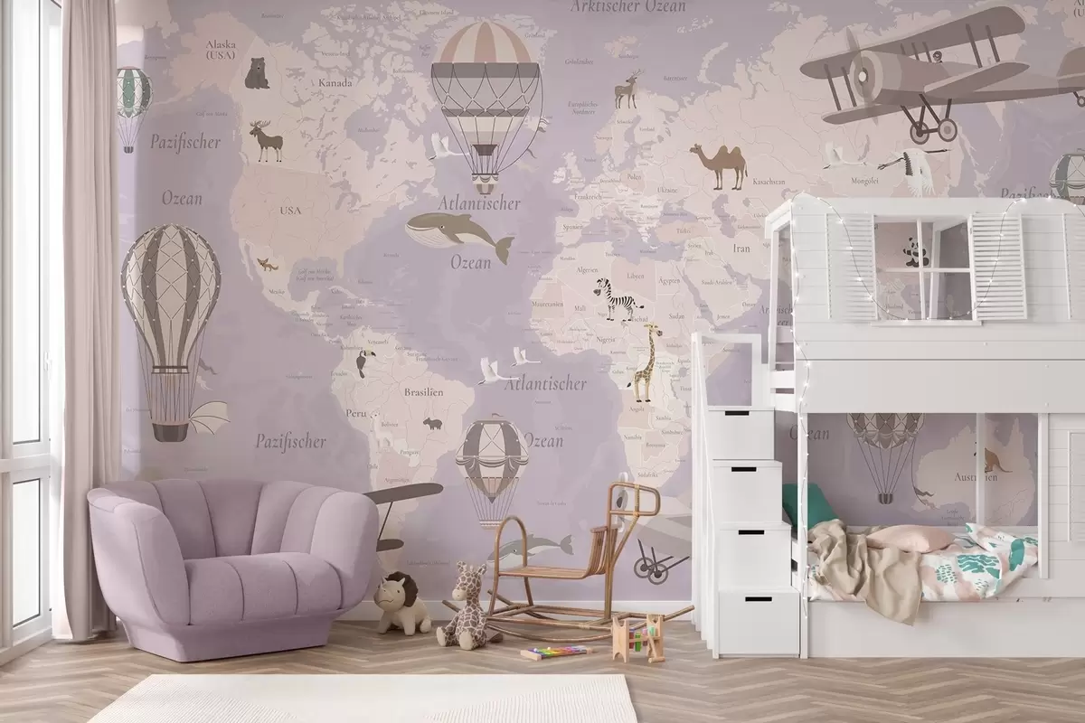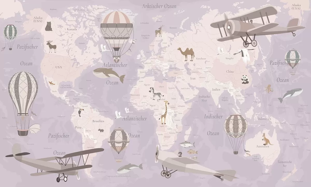 Fototapeedid Laste maailmakaart loomade, lennukite ja kuumaõhupallidega. Saksa keeles. Lilla värv Nr c00003dev4