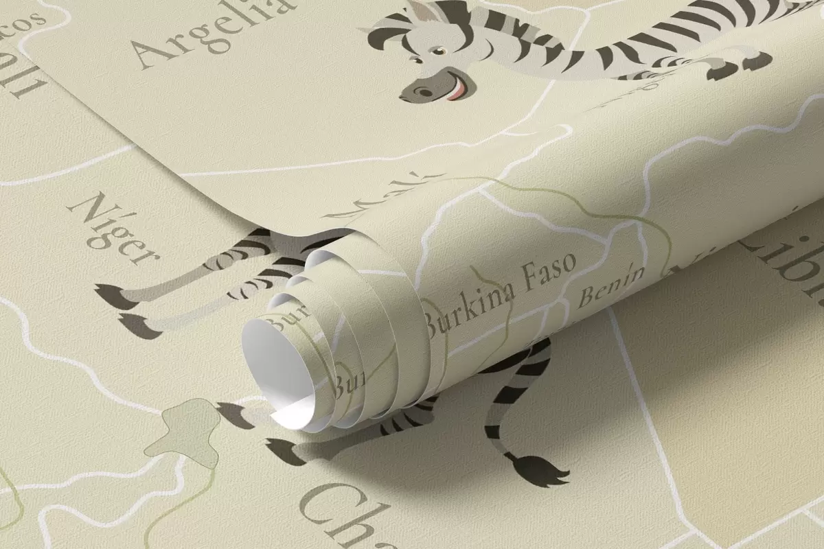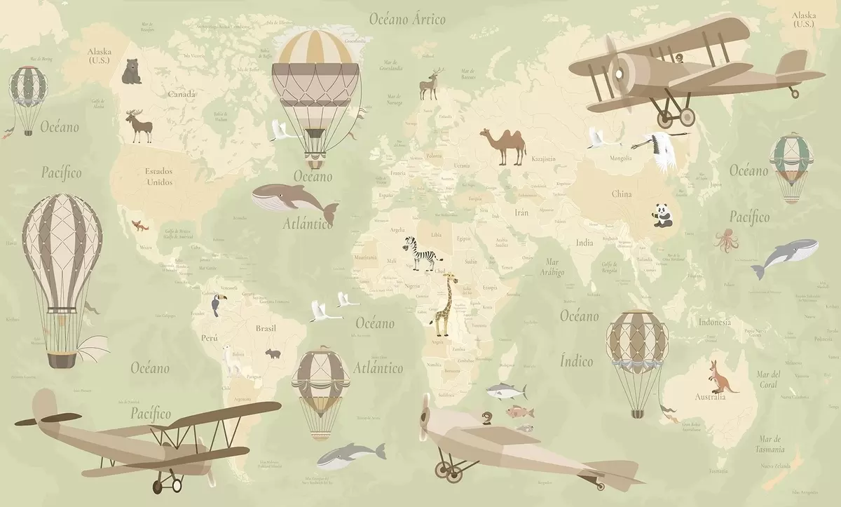 Fototapeedid Laste maailmakaart loomade, lennukite ja kuumaõhupallidega. Hispaania keeles. Roheline värv Nr c00003esv2