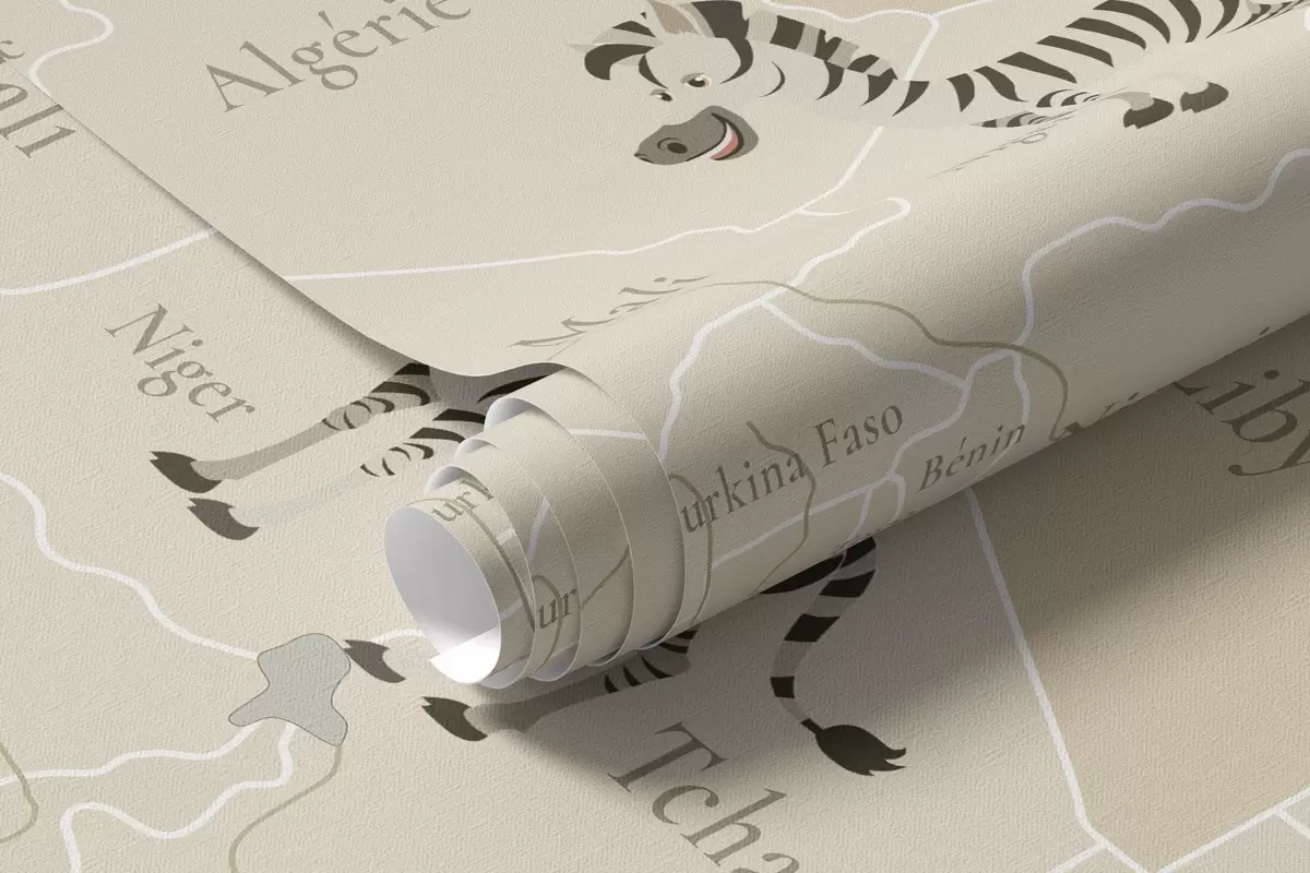 Fototapeedid Laste maailmakaart loomade, lennukite ja kuumaõhupallidega. Prantsuse keeles. Beež värv Nr c00003fr