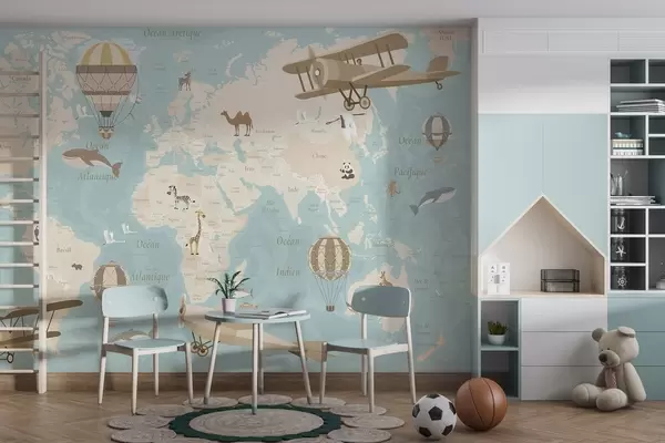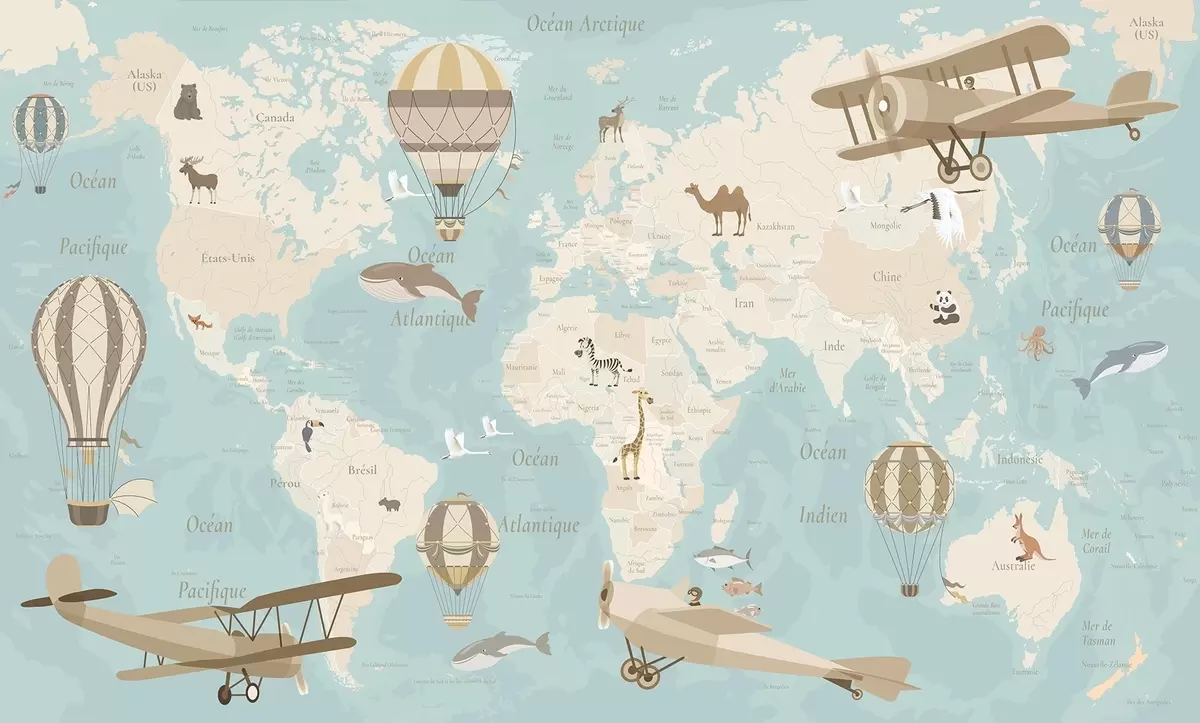 Fototapeedid Laste maailmakaart loomade, lennukite ja kuumaõhupallidega. Prantsuse keeles. Sinine värv Nr c00003frv1