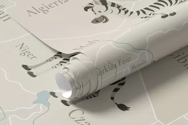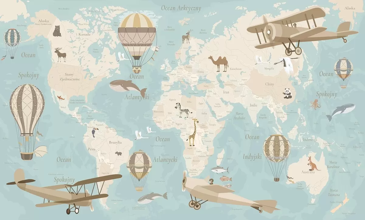 Fototapeedid Laste maailmakaart loomade, lennukite ja kuumaõhupallidega. Poola keeles. Sinine värv Nr c00003plv1