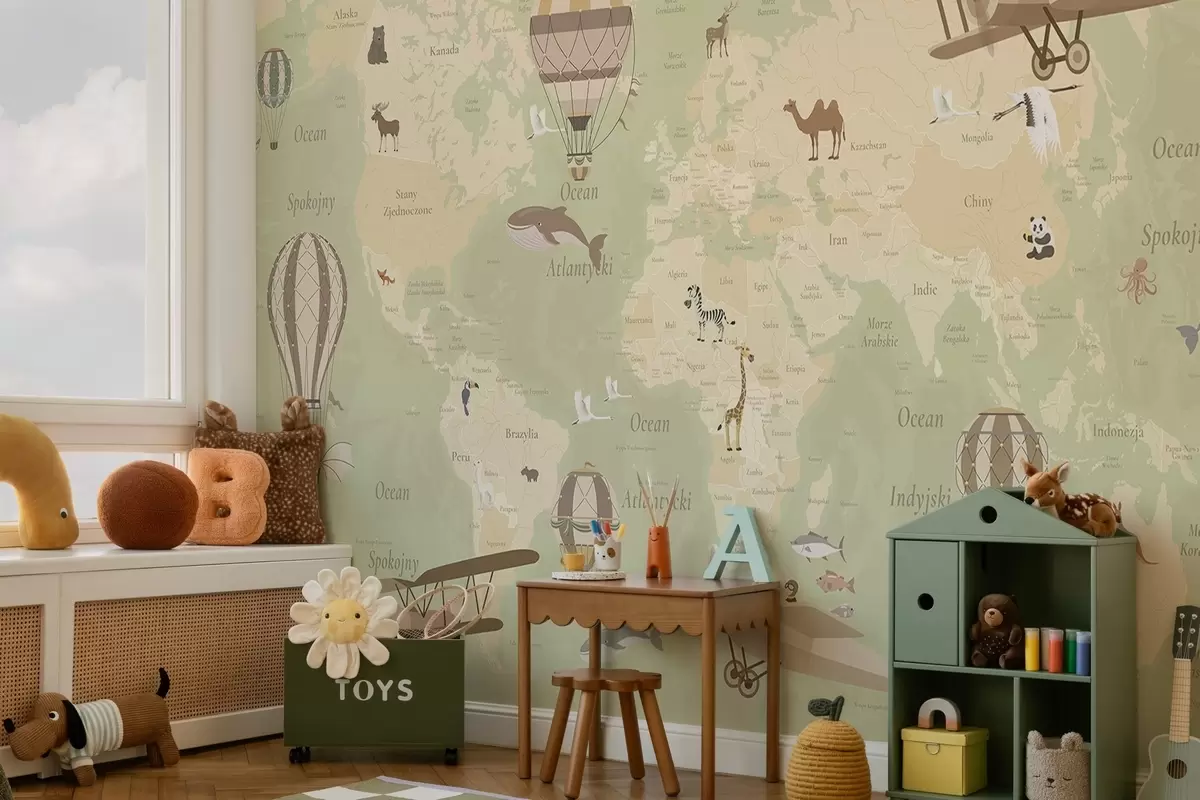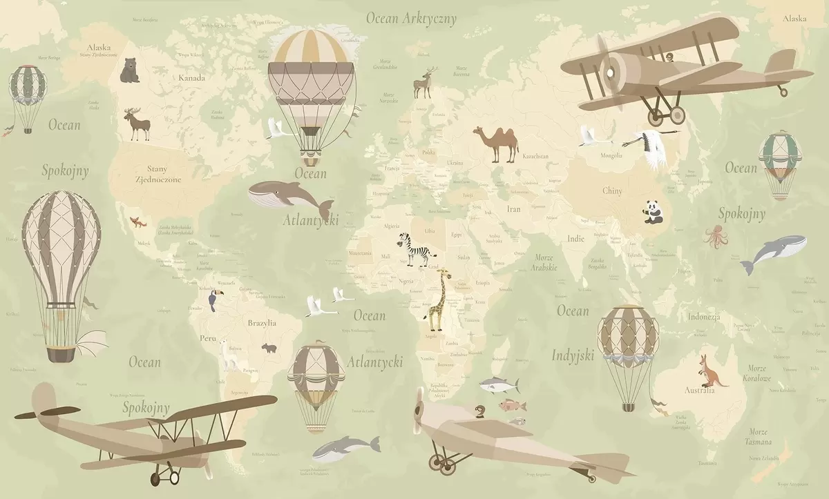 Fototapeedid Laste maailmakaart loomade, lennukite ja kuumaõhupallidega. Poola keeles. Roheline värv Nr c00003plv2