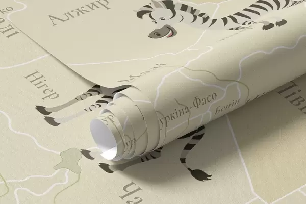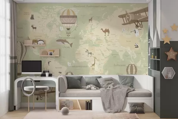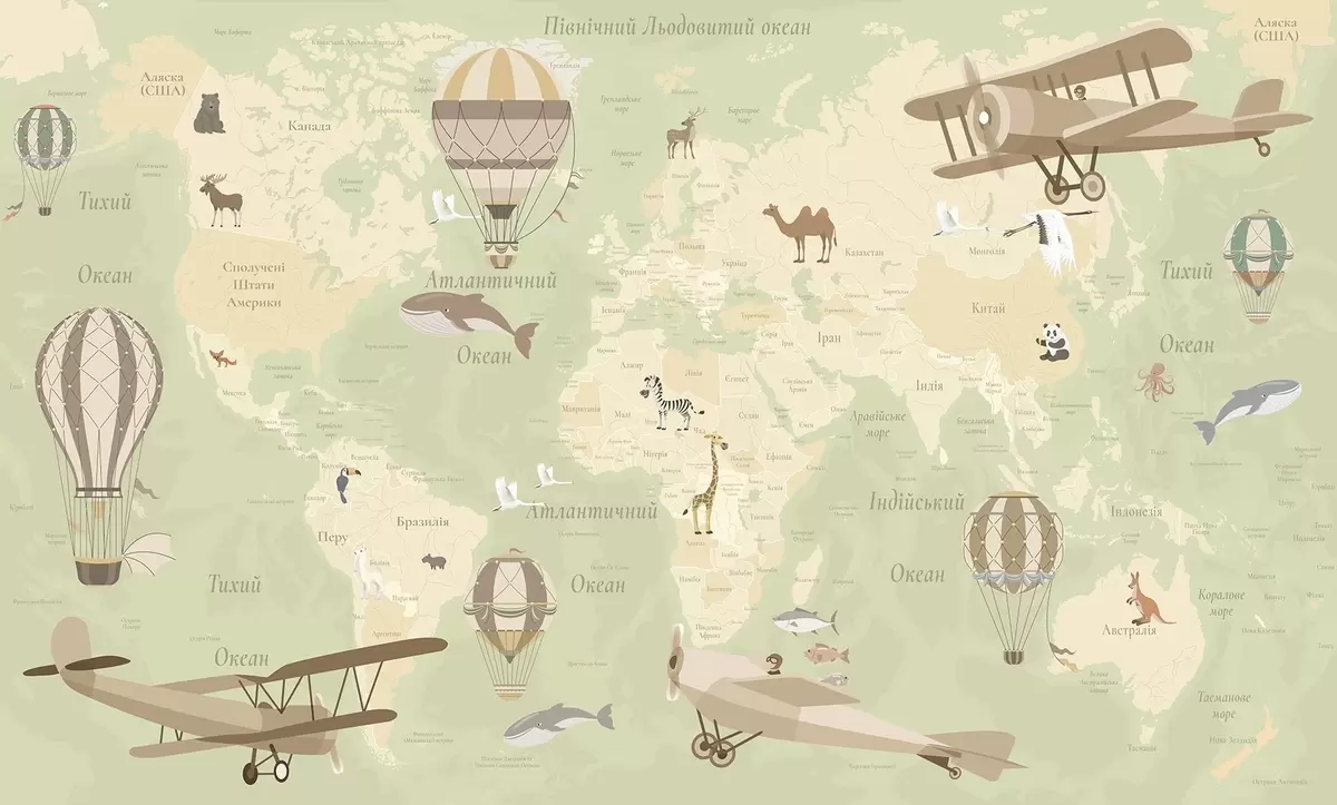 Fototapeedid Laste maailmakaart loomade, lennukite ja kuumaõhupallidega. Ukraina keeles. Roheline värv Nr c00003ukv2