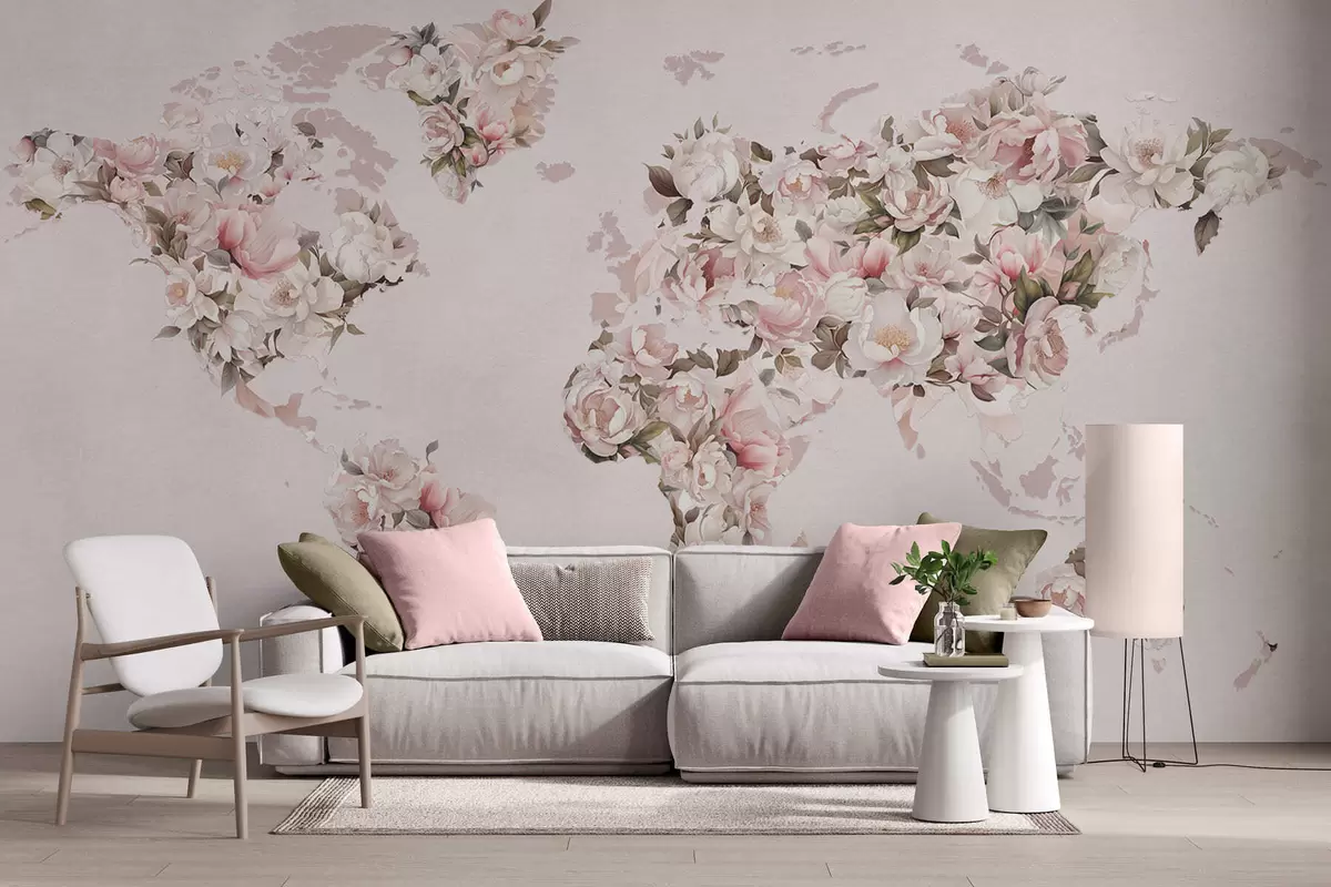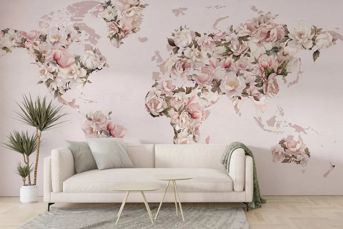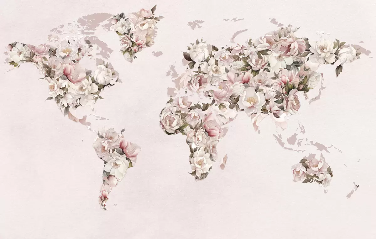 Fototapeedid Roosa maailmakaart, mis on tehtud suurtest valgetest ja roosadest pioonidest Nr c00005