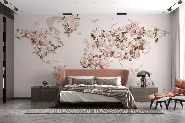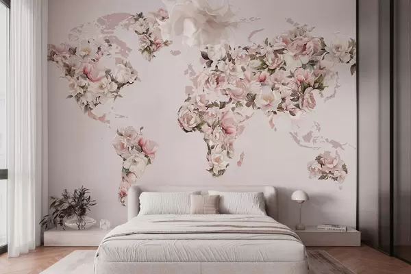 Fototapeedid Roosa maailmakaart, mis on tehtud suurtest valgetest ja roosadest pioonidest Nr c00005