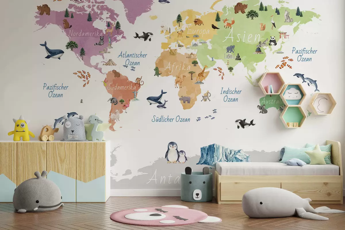Fototapeedid Akvarellistiilis värviline kaart, millel on kujutatud loomi, taimi ja arhitektuuri. Saksakeelsed nimetused Nr c00009de