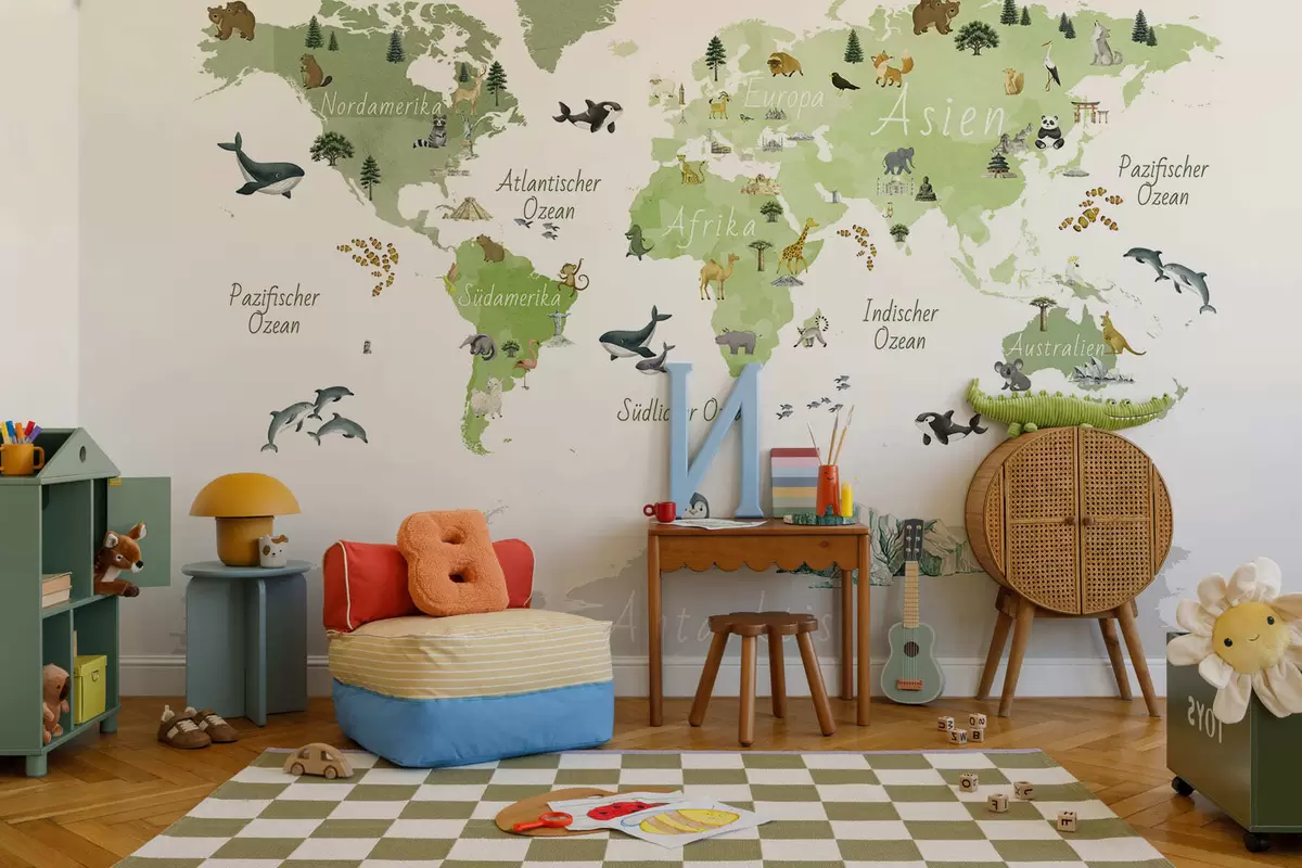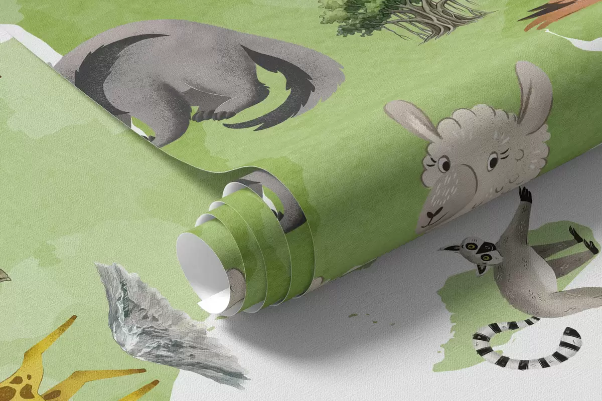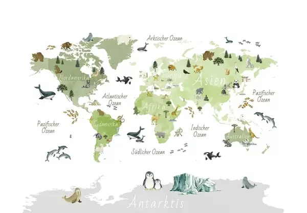 Fototapeedid Akvarellistiilis roheline kaart, millel on kujutatud loomi, taimi ja arhitektuuri. Saksakeelsed nimetused Nr c00009dev2