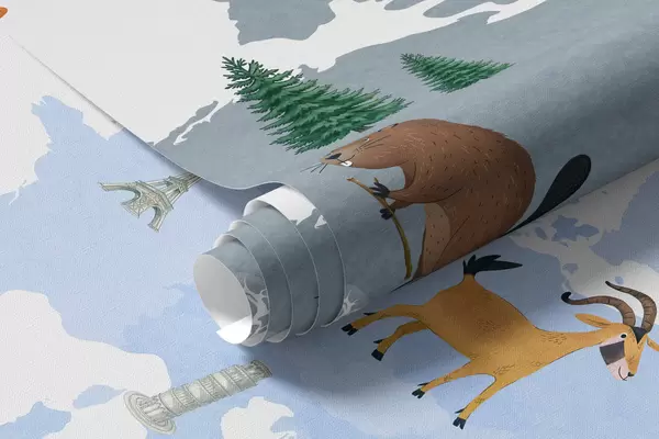 Fototapeedid Akvarellistiilis sinine kaart, millel on kujutatud loomi, taimi ja arhitektuuri. Kirjed on inglise keeles Nr c00009env1