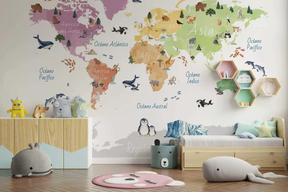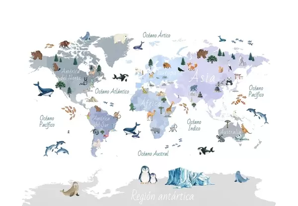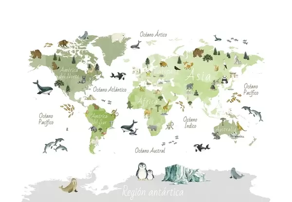 Fototapeedid Akvarellistiilis värviline kaart, millel on kujutatud loomi, taimi ja arhitektuuri. Kirjed hispaania keeles Nr c00009es