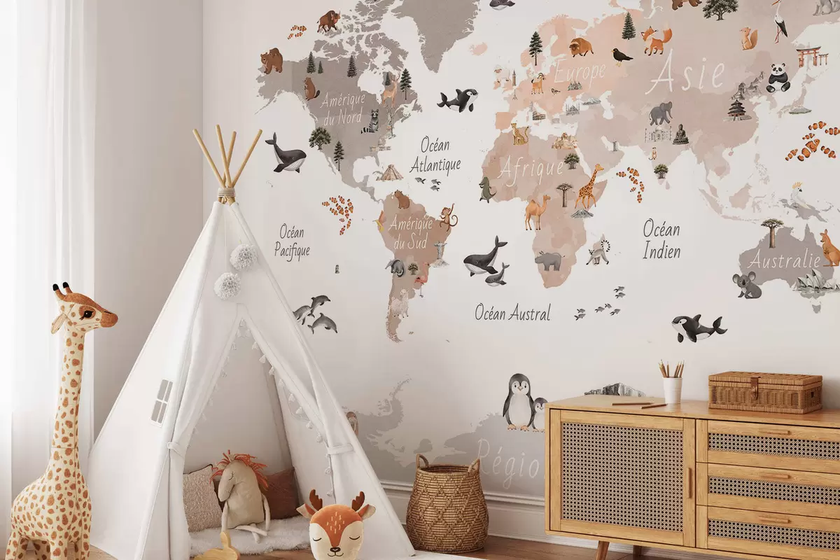 Fototapeedid Akvarellistiilis beež kaart, millel on kujutatud loomi, taimi ja arhitektuuri. Kirjed prantsuse keeles Nr c00009frv3