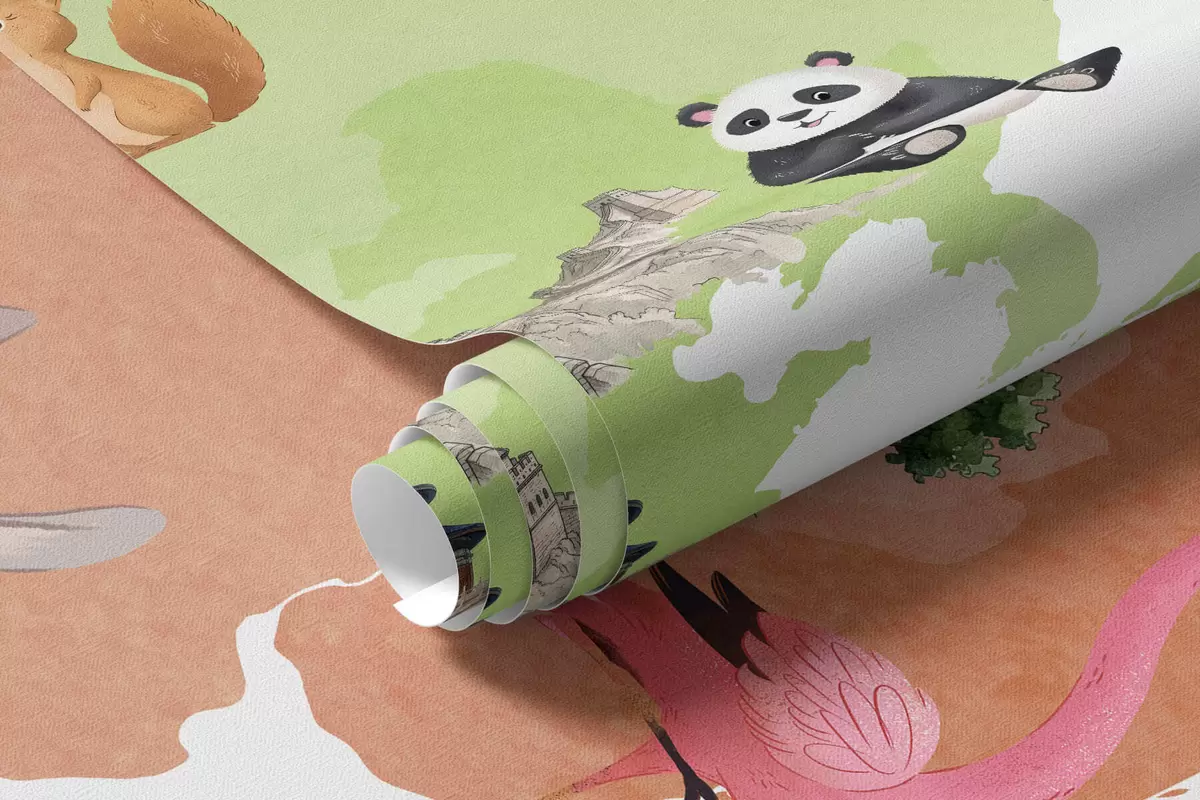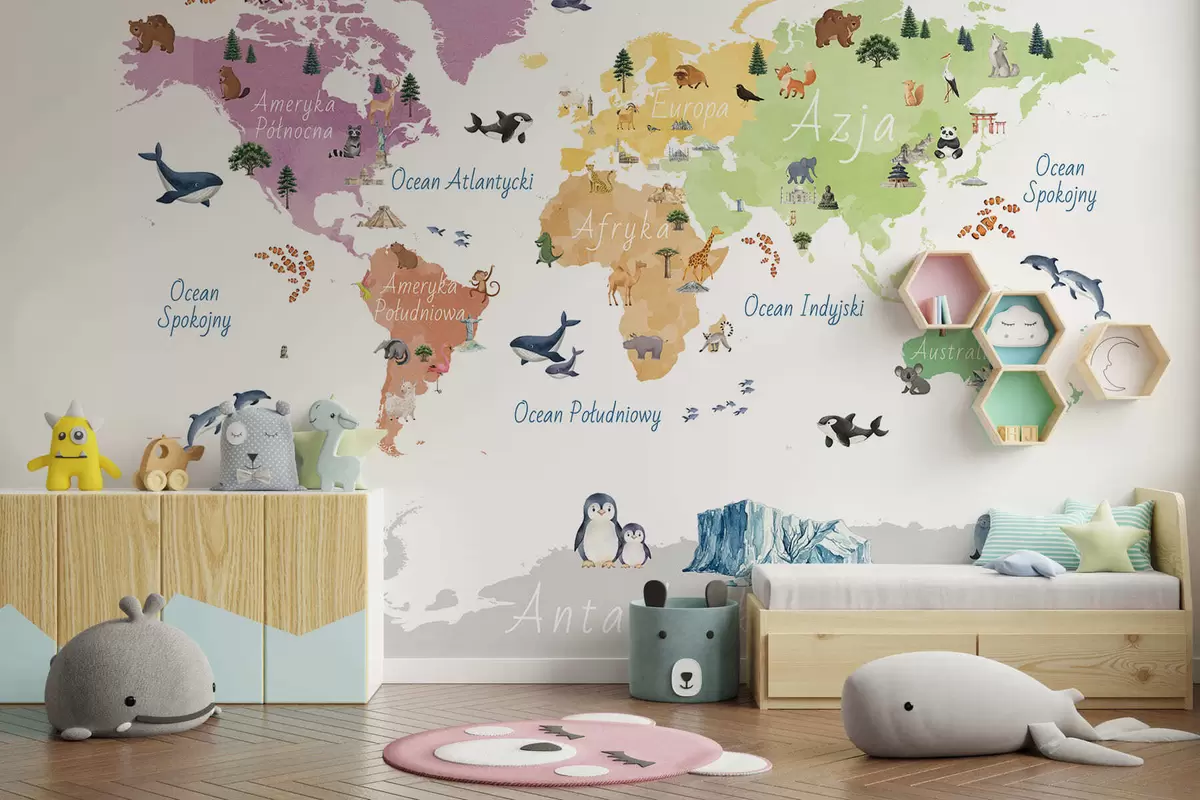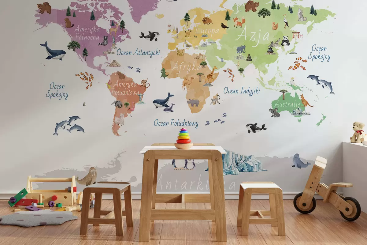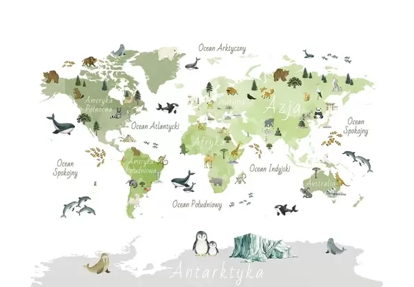 Fototapeedid Akvarellistiilis värviline kaart, millel on kujutatud loomi, taimi ja arhitektuuri. Kirjed on poola keeles Nr c00009pl