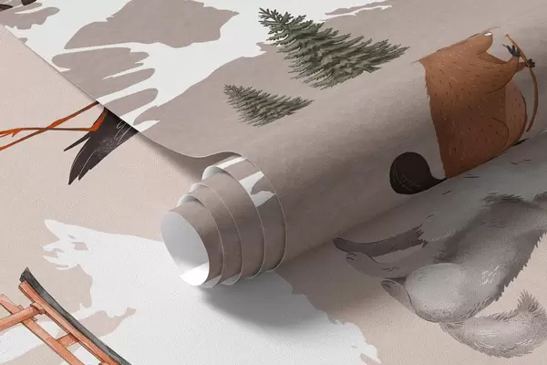 Fototapeedid Akvarellistiilis beež kaart, millel on kujutatud loomi, taimi ja arhitektuuri. Kirjed poola keeles Nr c00009plv3