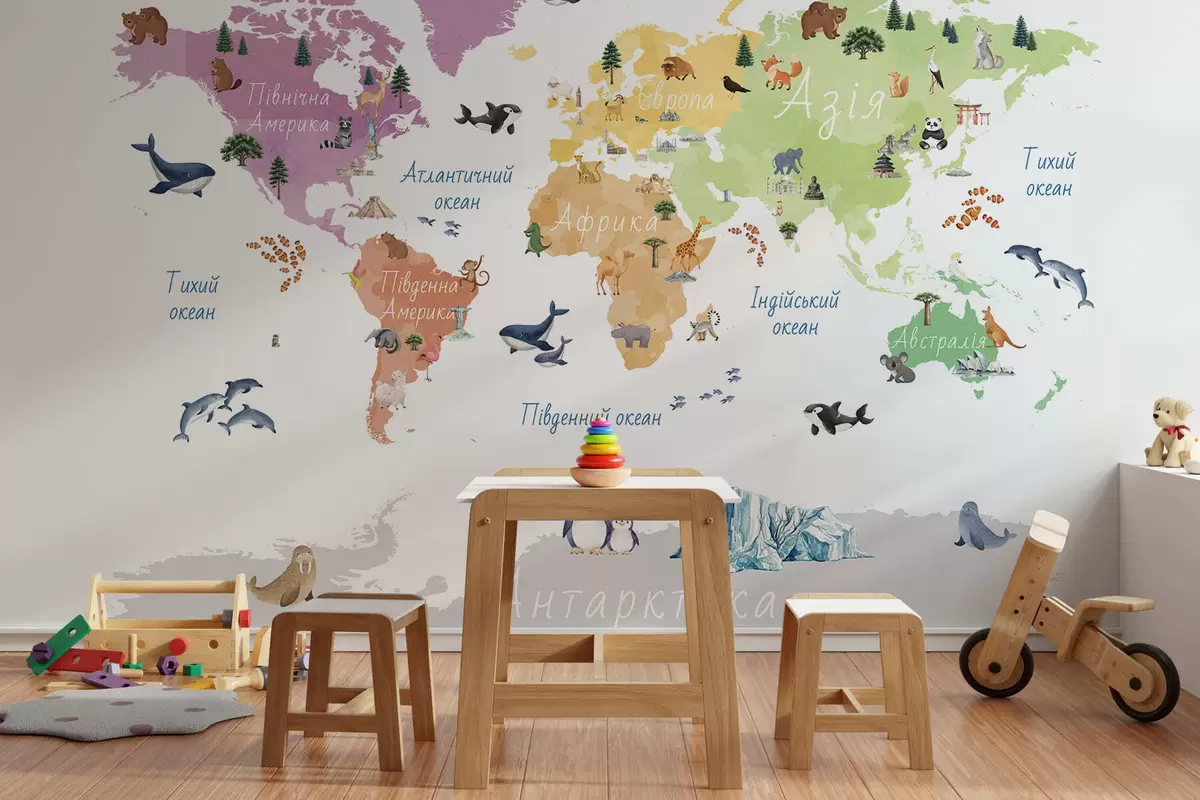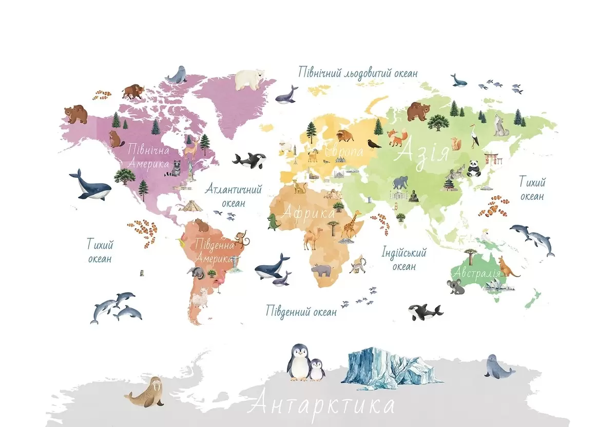 Fototapeedid Akvarellistiilis värviline kaart, millel on kujutatud loomi, taimi ja arhitektuuri. Kirjed ukraina keeles Nr c00009uk