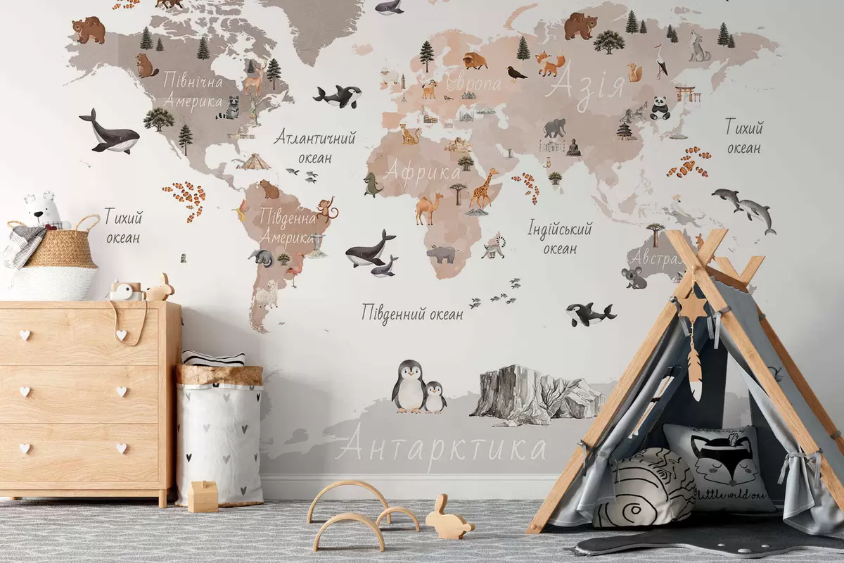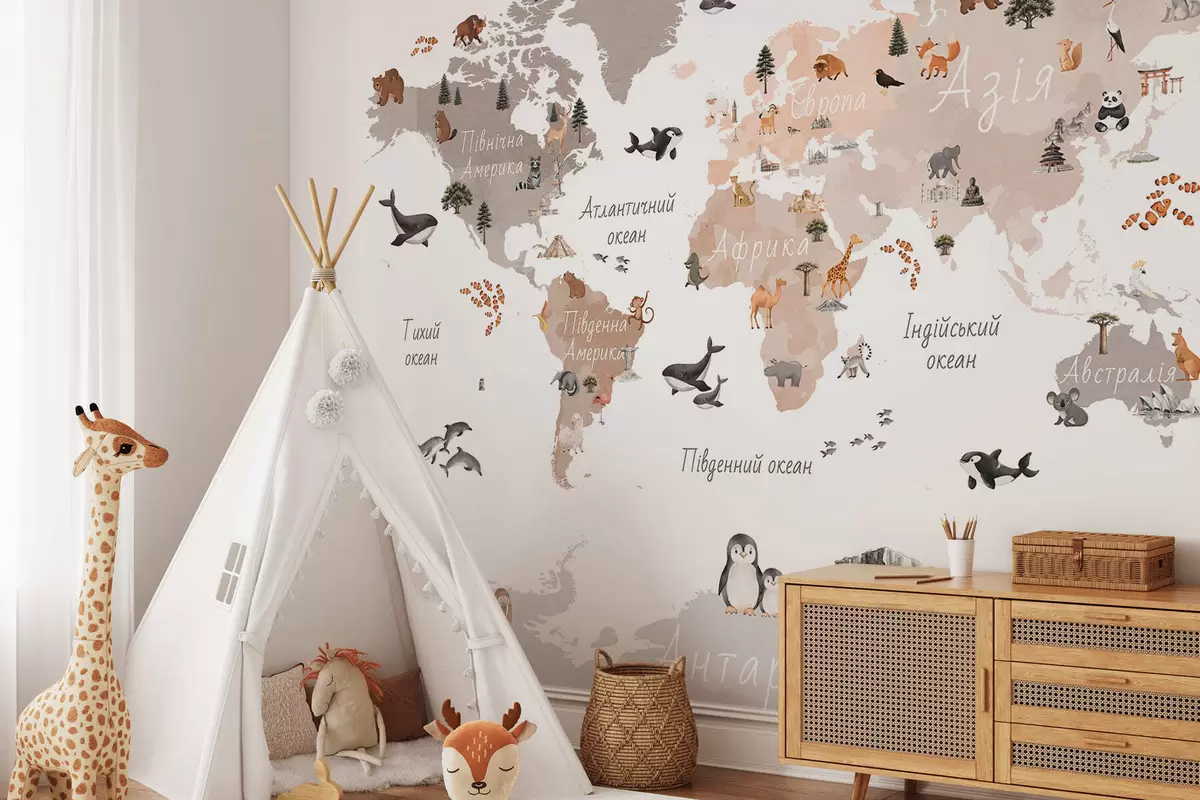 Fototapeedid Akvarellistiilis beež kaart, millel on kujutatud loomi, taimi ja arhitektuuri. Kirjed ukraina keeles Nr c00009ukv3