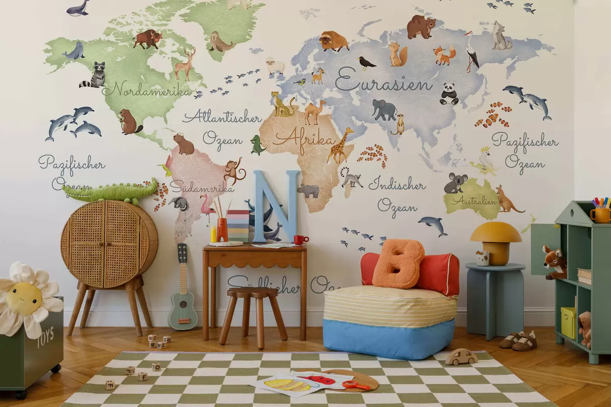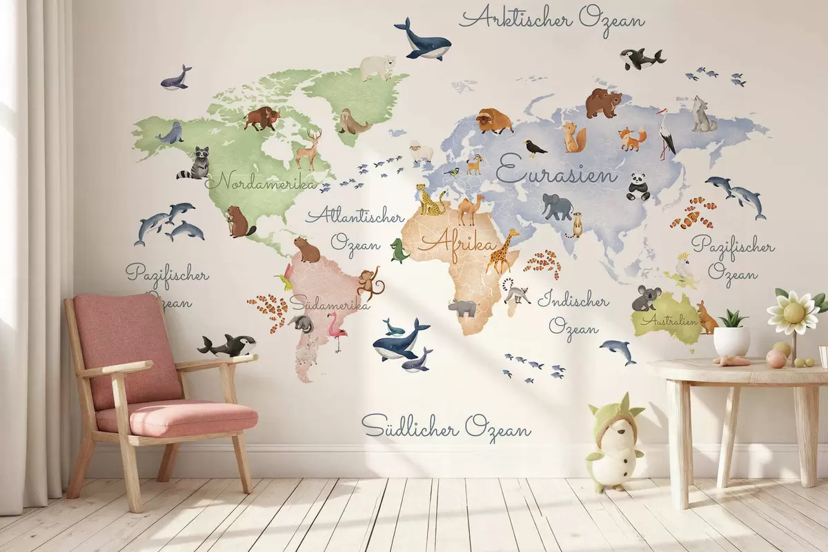 Fototapeedid Akvarellistiilis valge kaart, millel on kujutatud loomi. Saksakeelsed nimetused Nr c00012de