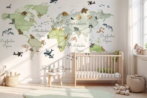 Fototapeedid Akvarellistiilis roheline kaart, millel on kujutatud loomi. Saksakeelsed nimetused Nr c00012dev2