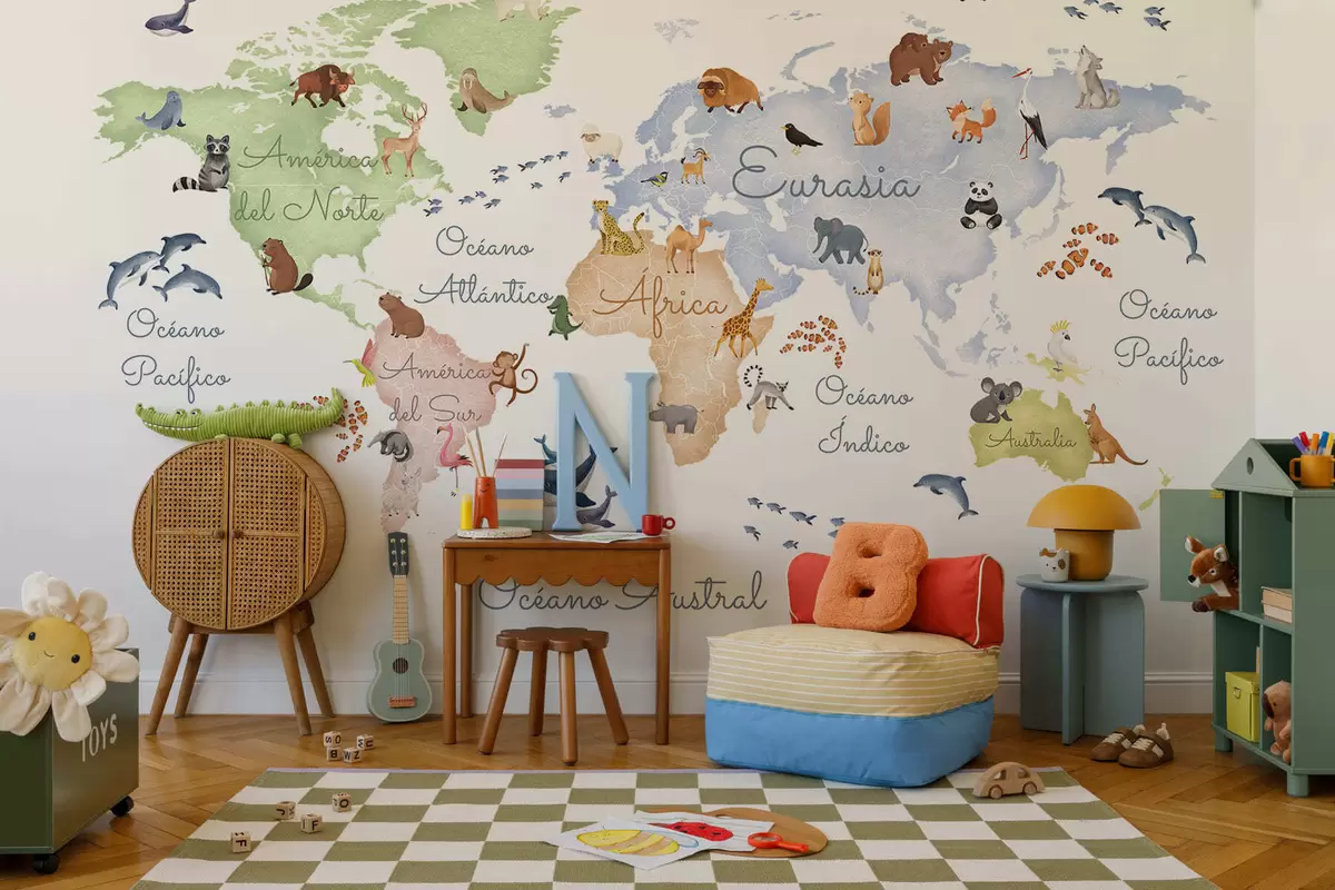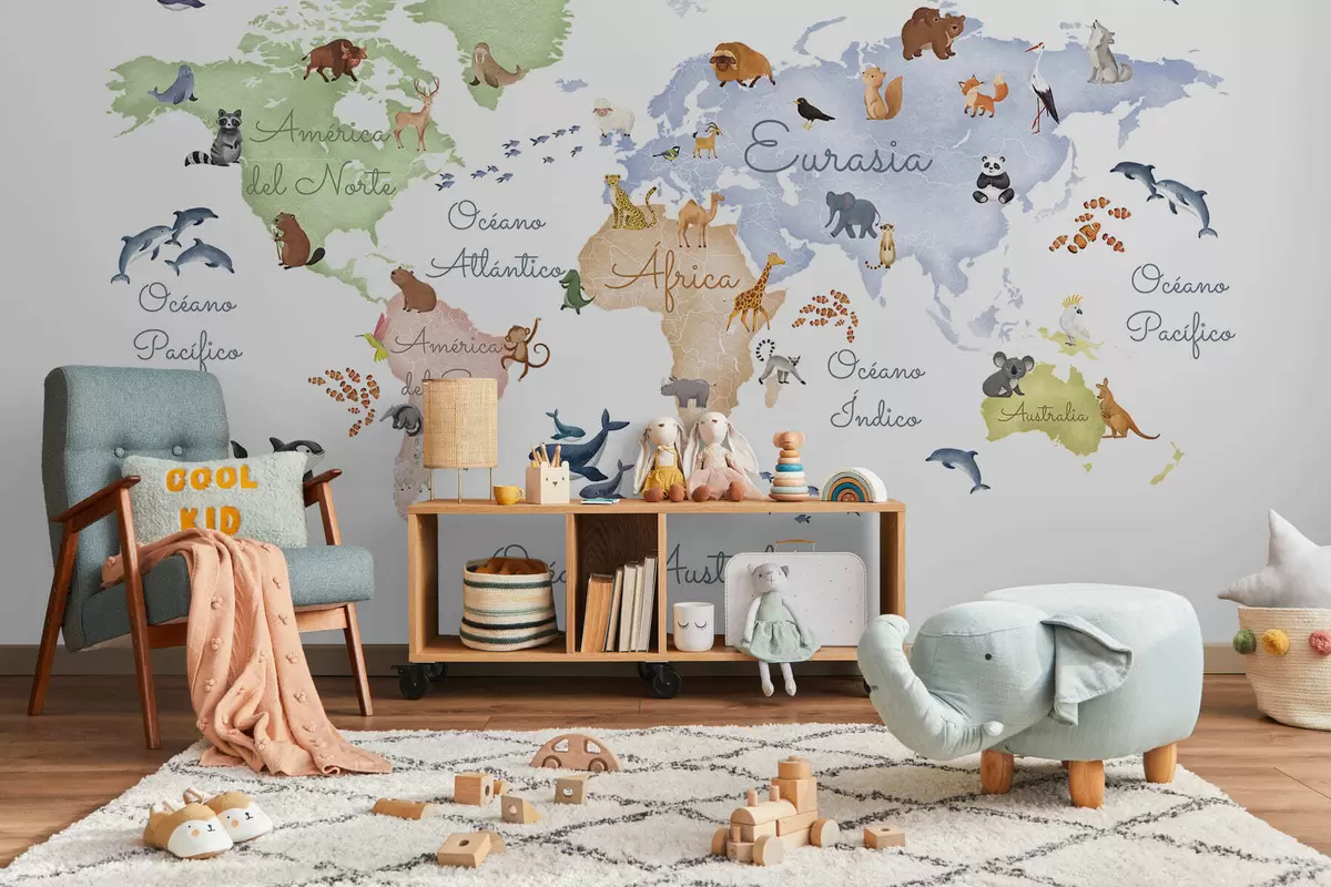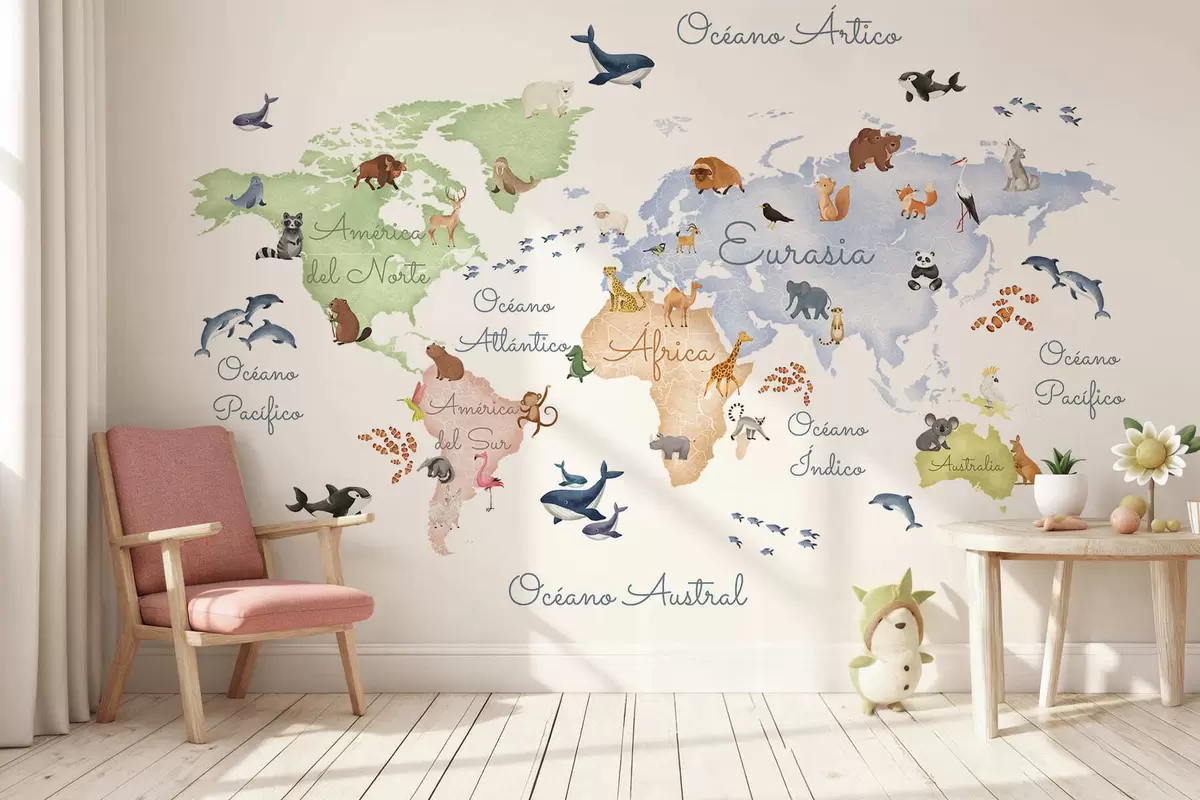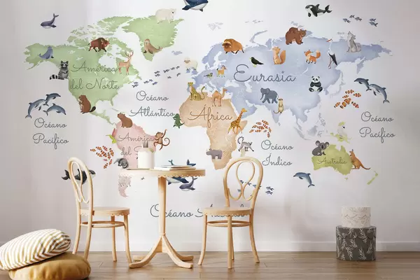 Fototapeedid Akvarellistiilis värviline kaart, millel on kujutatud loomi. Kirjed hispaania keeles Nr c00012es