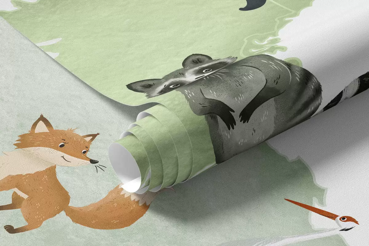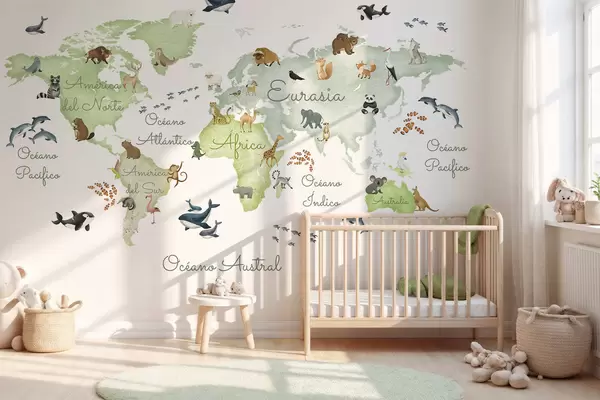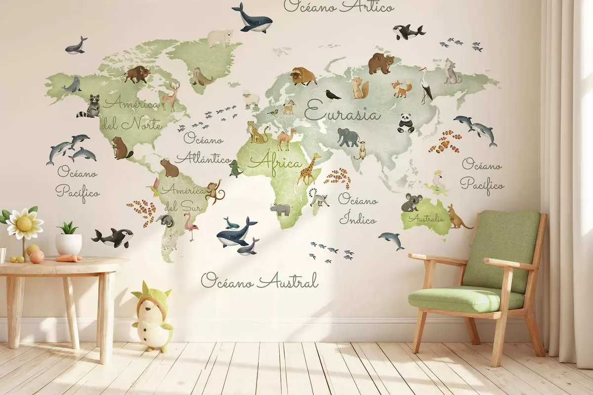 Fototapeedid Akvarellistiilis roheline kaart, millel on kujutatud loomi. Kirjed hispaania keeles Nr c00012esv2