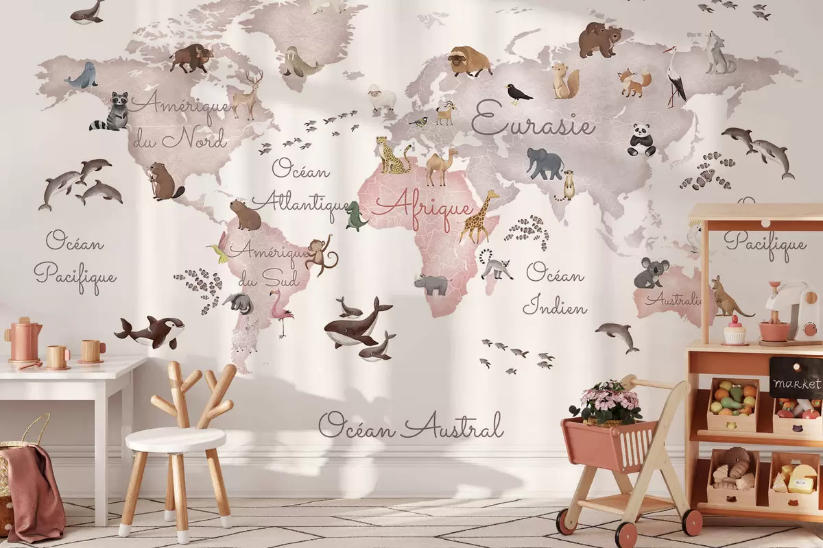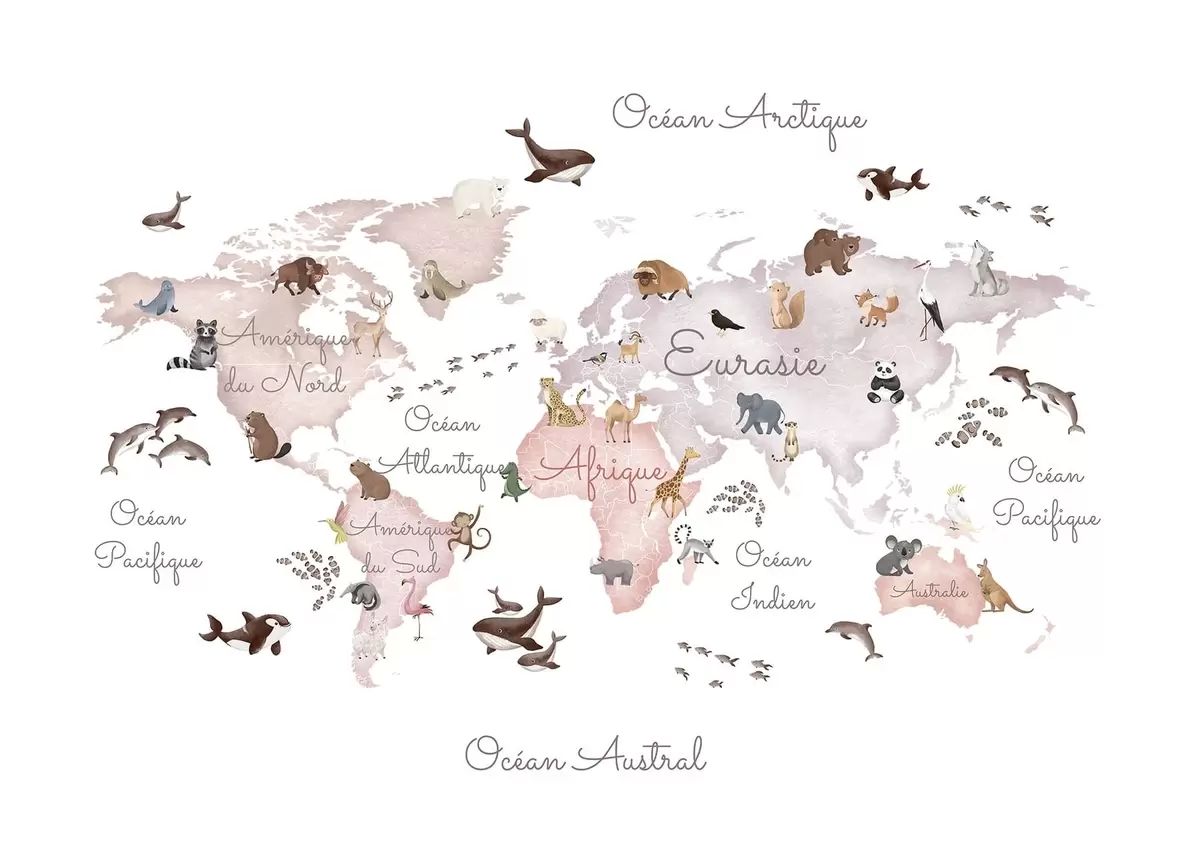 Fototapeedid Beige akvarellistiilis kaart, millel on kujutatud loomi. Kirjed prantsuse keeles Nr c00012frv3