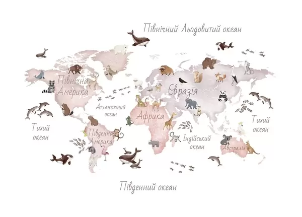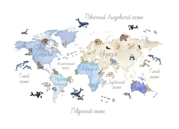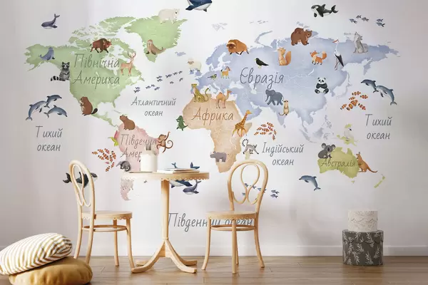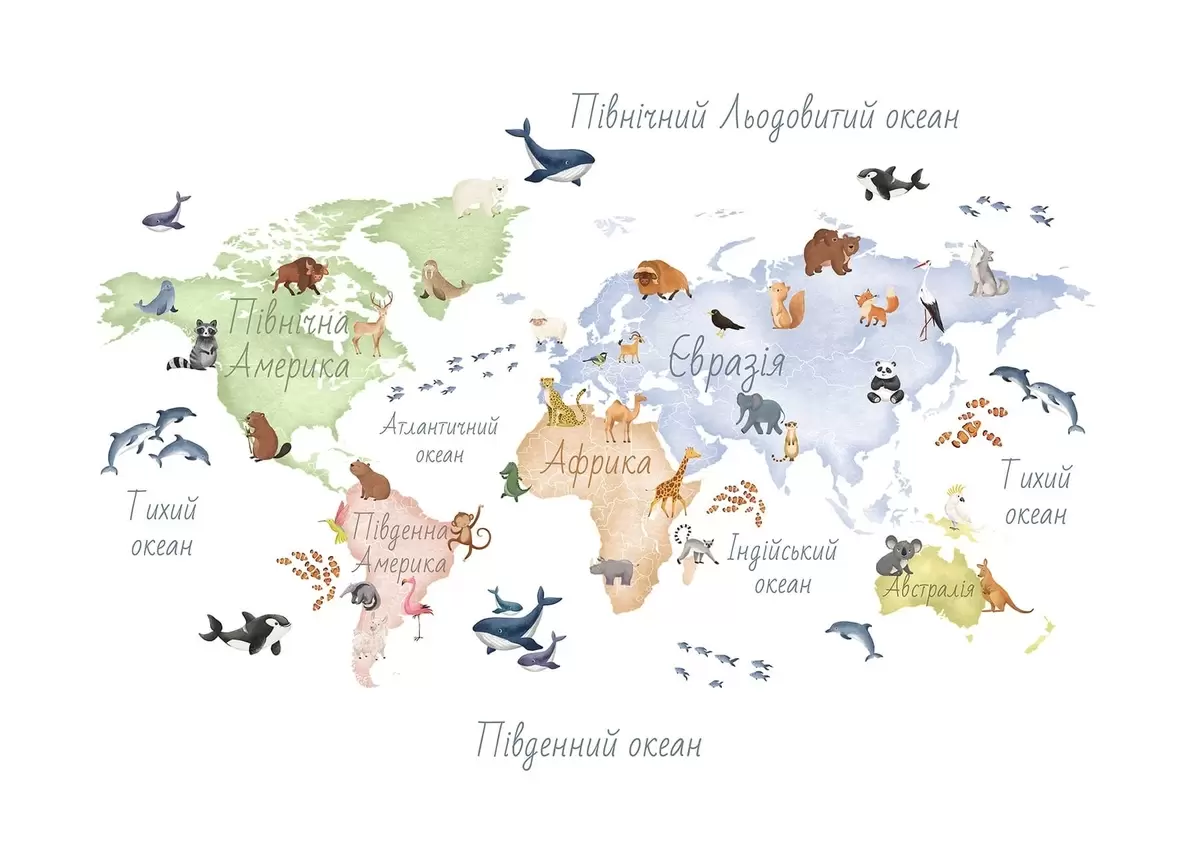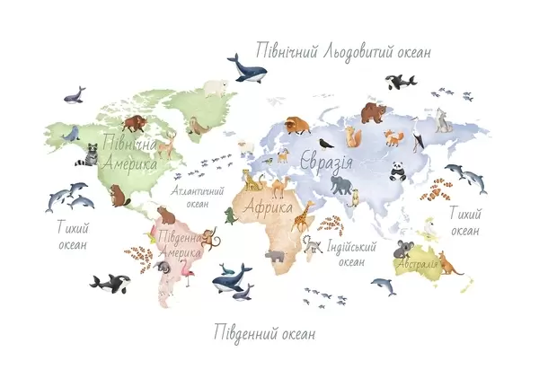 Fototapeedid Akvarellistiilis värviline kaart, millel on kujutatud loomi. Kirjed ukraina keeles Nr c00012uk