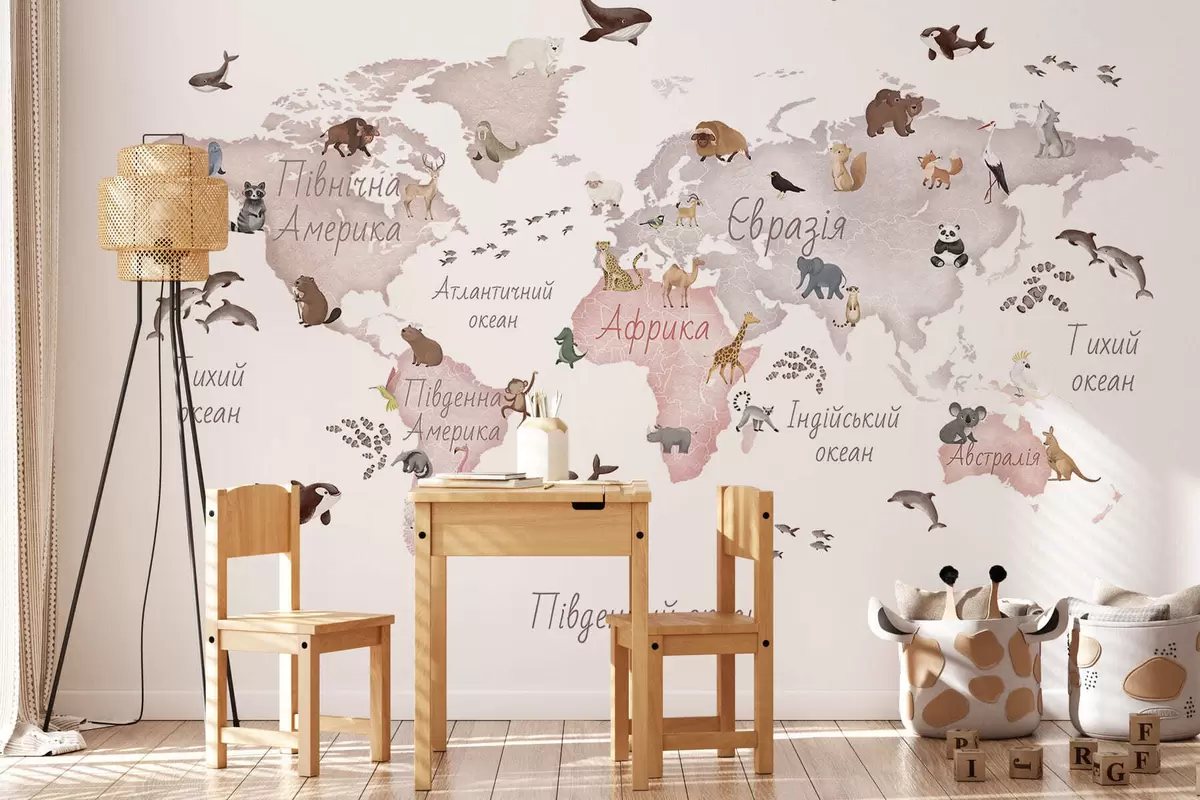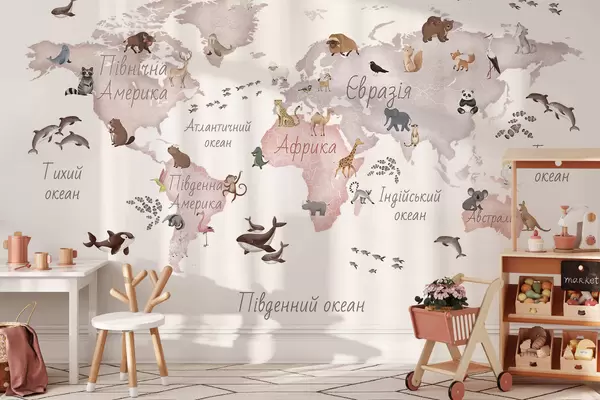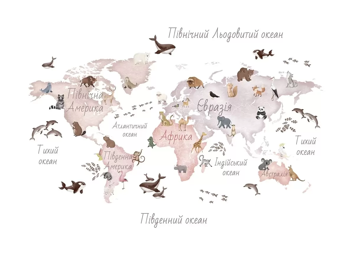 Fototapeedid Akvarellistiilis beež kaart, millel on kujutatud loomi. Kirjed ukraina keeles Nr c00012ukv3