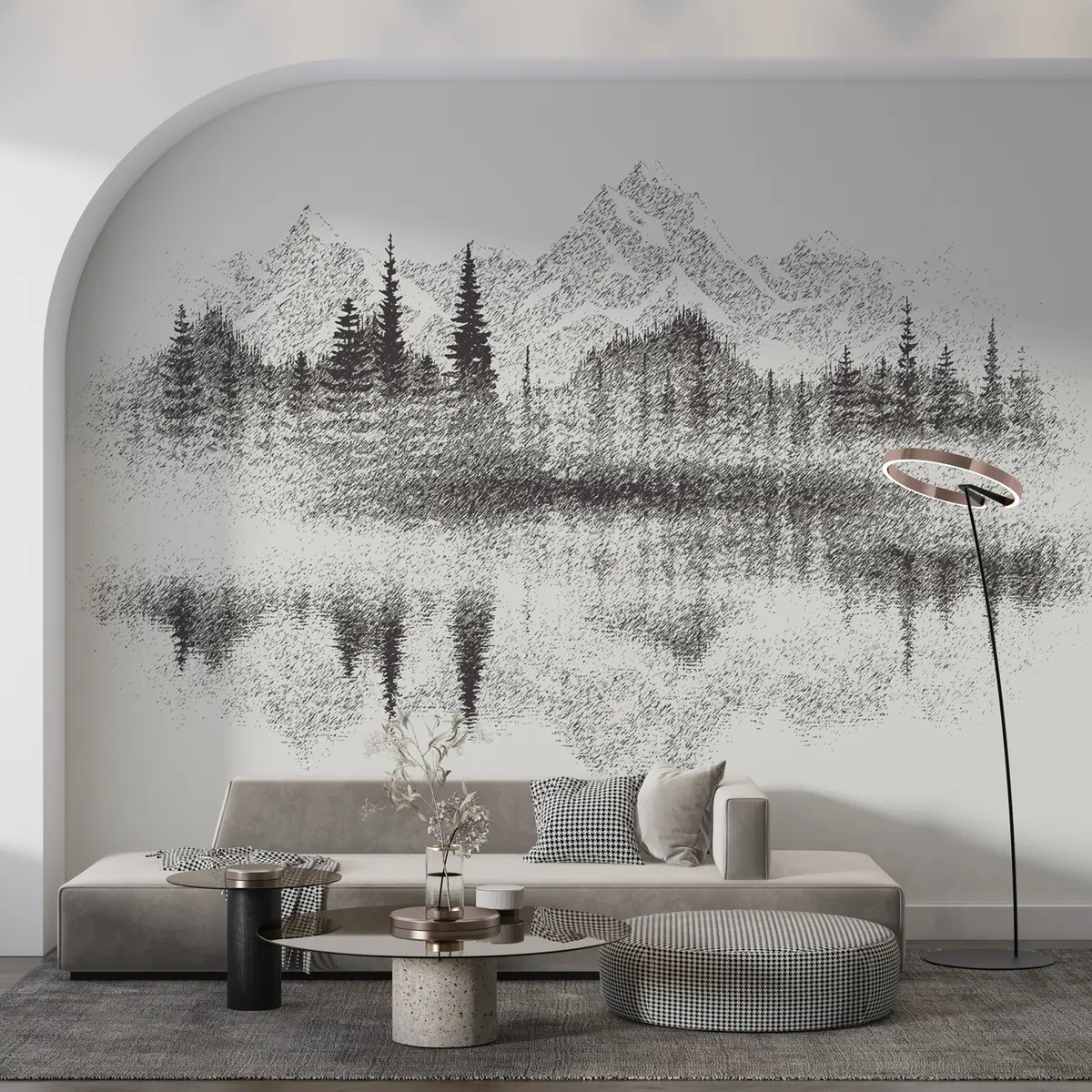 Fototapeedid Mets ja mäed peegelduvad järves Nr u98808
