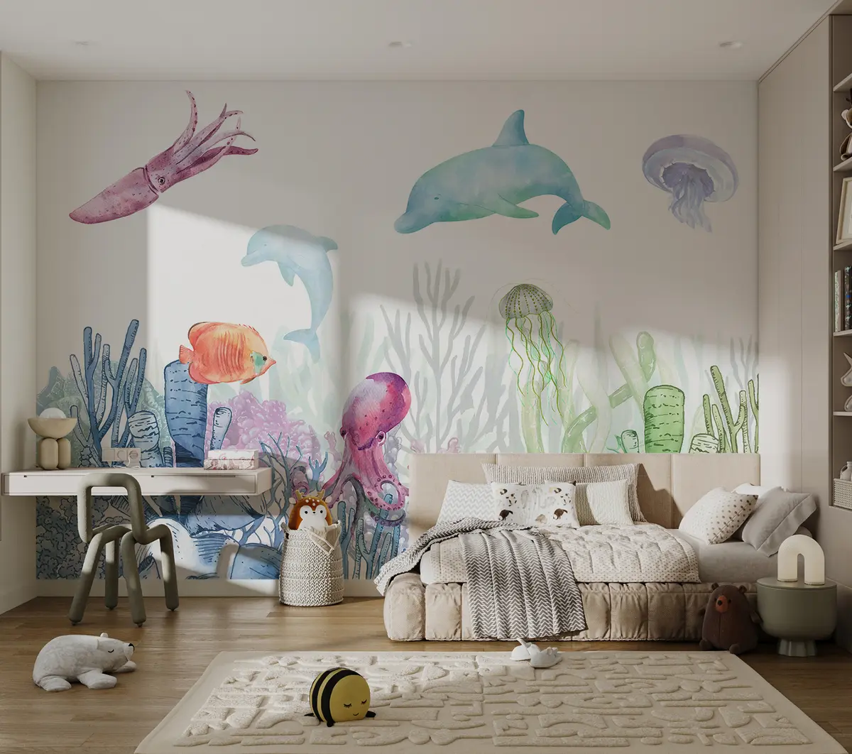 Fototapeedid Veealune elu, mere loomad, akvarell, korallid, delfiin, kaheksajalg, kaheksajalg Nr u98899