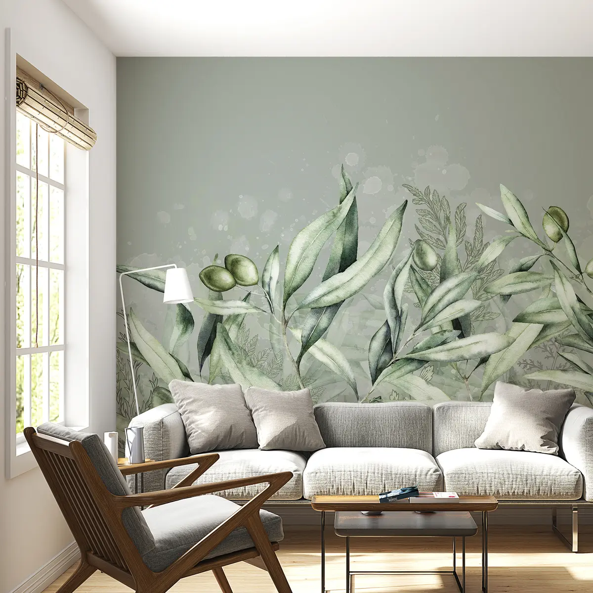 Fototapeedid Oliivide illustratsioon, lillekujundus, troopiline, akvarell, suured lehed, rohelised värvid Nr w00407