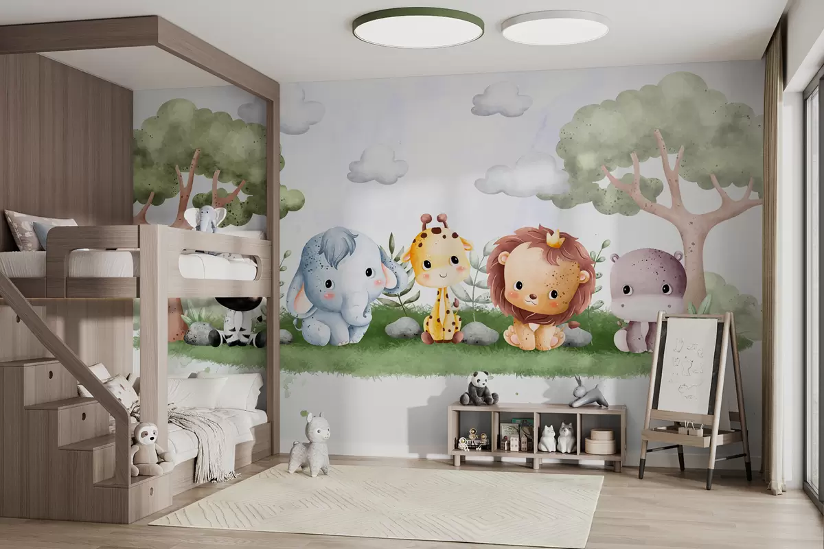 Fototapeedid Grupp armsaid multifilmiloomi, kes istuvad rohuväljal puude ja pilvede taustal Nr w00705