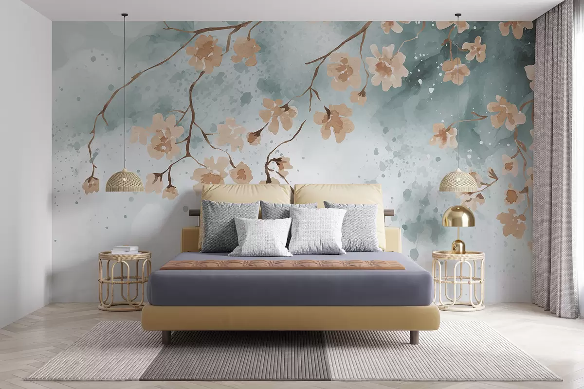 Fototapeedid Täitsa õitsevad õrnroosad kirsiõied puuokstel akvarellvärvi taustal Nr w00900