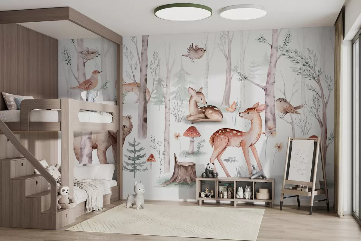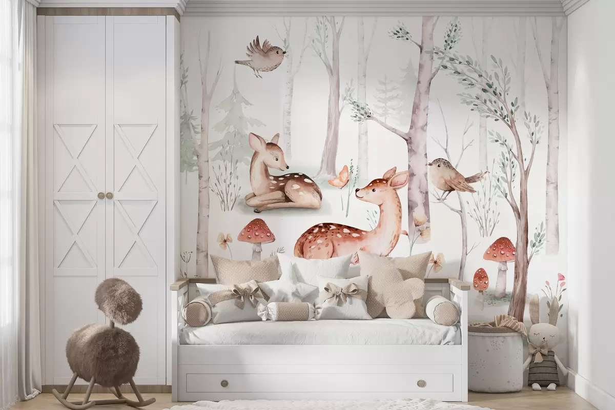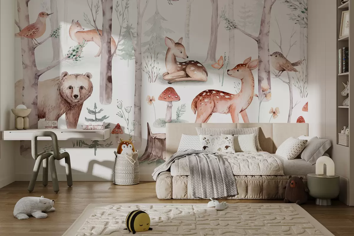 Fototapeedid Tapeet lastetoas, metsloomad. Õrn akvarellistiilis tapeet meeldivates soojades pastelsetes värvides valgel taustal Nr w01089